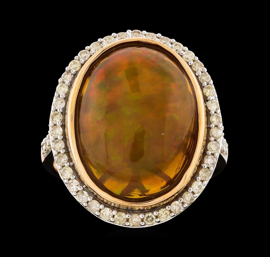 One electronically tested 14KT rose gold ladies cast opal and diamond ring. The featured opal is set within a diamond bezel supported by a lattice under gallery and diamond set shoulders, completed by a three millimeter wide band. Bright polish finish with rhodium accents. Trademark is Orianne. Identified with markings of "14K". Condition is new, good workmanship. Containing: One semi crystal opal that is cut in a oval shaped cabochon and is bezel set, measuring 18.00 mm long x 13.50 mm wide, and 7.20 mm thick and the approximate weight is 8.56 carats. The opal has a bright, multicolor play of color (fire) in a flashfire pattern; a medium dome; a good cut; no inclusions; slight variation in base in its brightness and pattern; and is slightly directional. Graded in the setting. Forty-Eight prong set round brilliant cut diamonds approximate total weight of 48 Stones = 0.62ct. Graded in the setting. Clarity: I-2 to I-3. Color: H - J. Total Weight of Diamonds 0.62ct. Total Weight of Opals 8.56ct. Total Weight of Ring 8.36gm. AIG Appraised.
