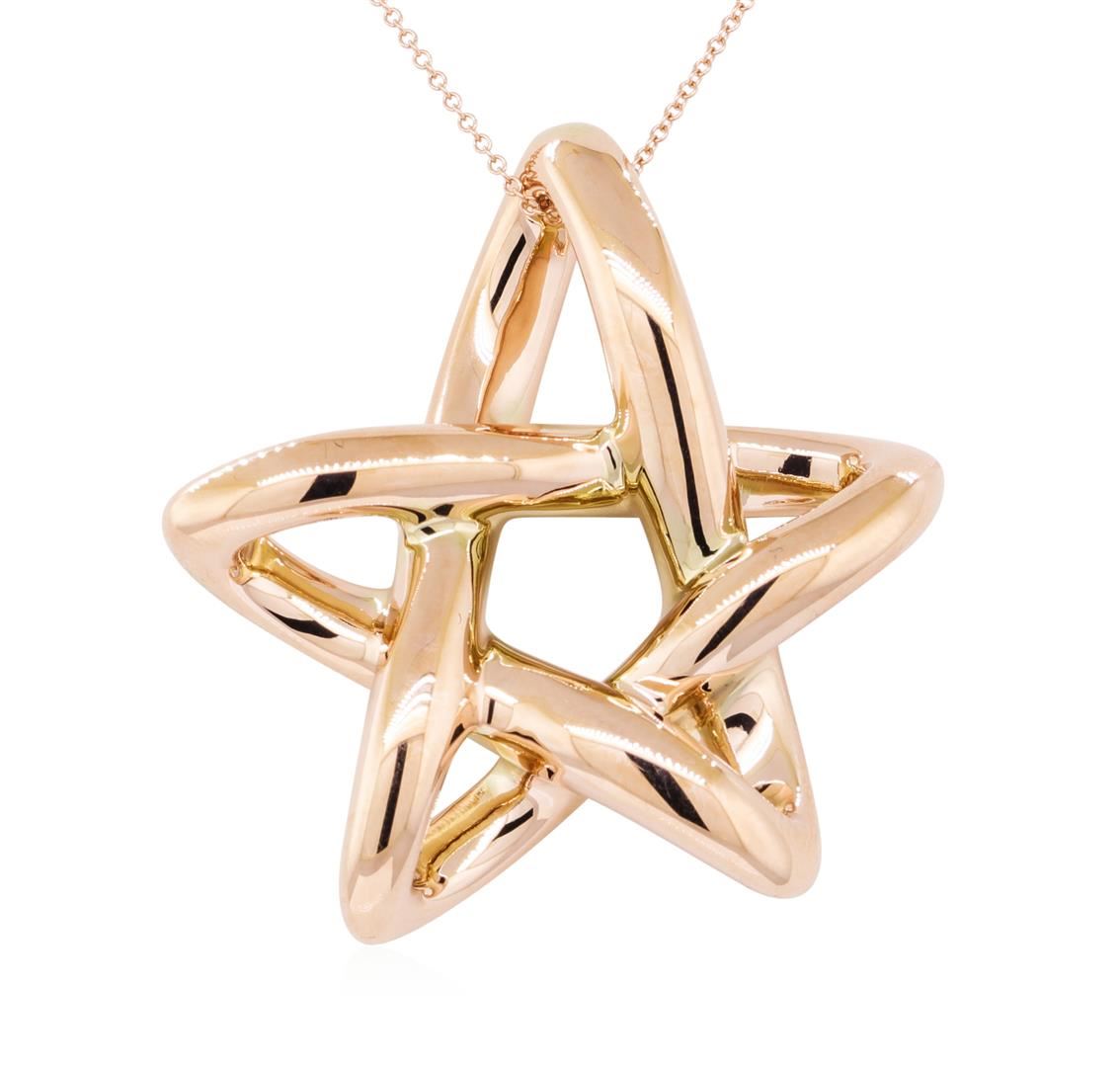 One star motif electroformed pendant with a sixteen inch long 0.8mm rounded cable link chain featuring: 14KT rose gold weighing 4.3 grams.