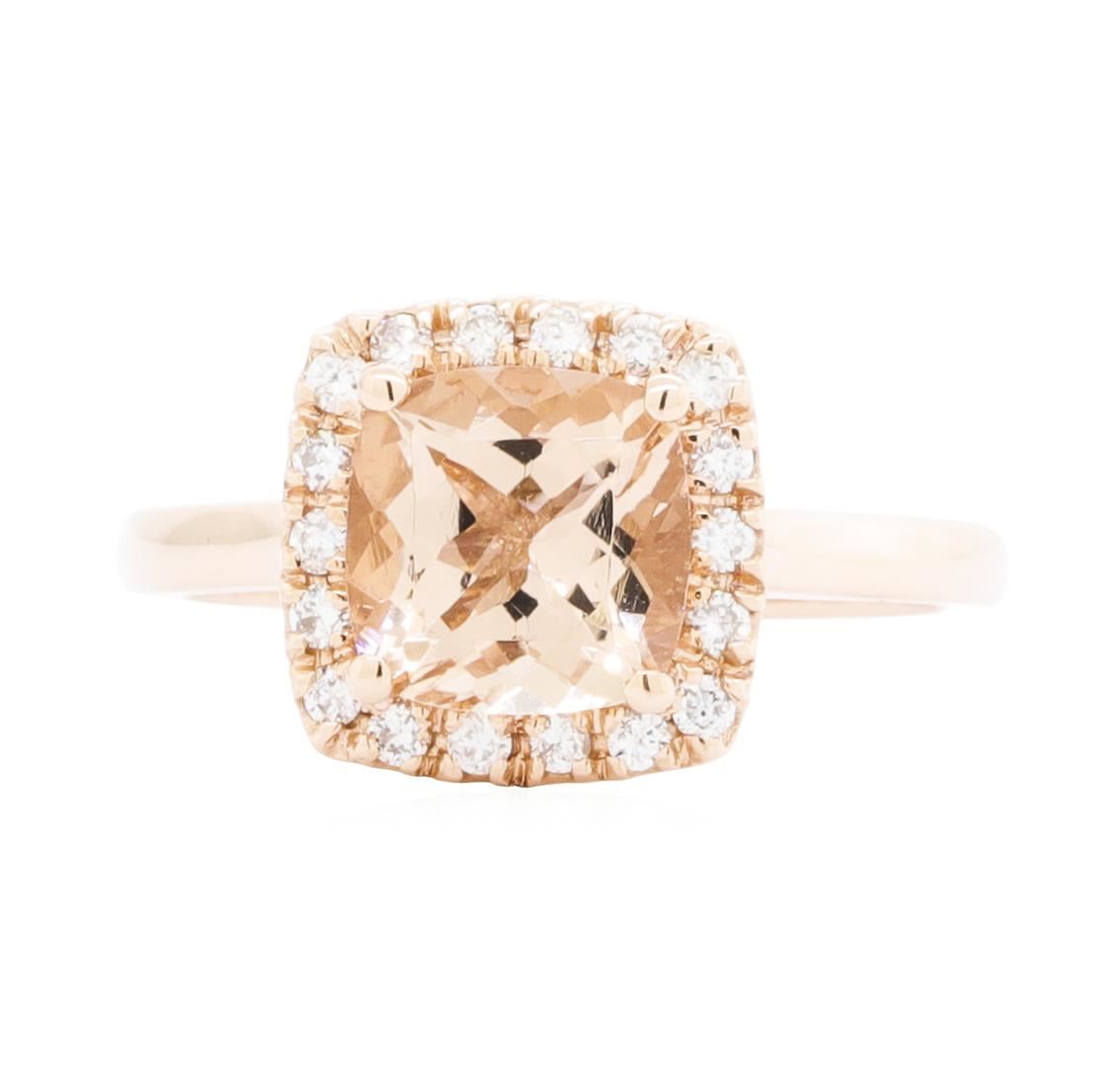 One electronically tested 14KT rose gold lady's cast fashion ring with a square cushion halo with a bright polish finish. The featured lady's ring has a shank measuring 1.98 millimeters wide. Identified with markings of '14K'. Condition is new, good workmanship. Containing: One prong set square cushion modified brilliant cut natural morganite, measuring 8.00 x 7.92 x 5.20mm, (depth est.) approximate weight of 2.10ct., clarity is eye clean, light, very slightly brownish, red orange color, (GIA RO 3/3), cut is very good. Colored gemstones are presumed to have been subjected to commonly used enhancement processes. Graded in the setting. Eighteen prong set round brilliant cut diamonds, measuring 1.60 - 1.50 x 0.96mm (depth est.) approximate total weight of 18 Stones = 0.25ct. Graded in the setting. Color H - I Clarity SI-1 to I-1 Cut Good. Total Weight of Colored Stones 2.10ct.. Total Weight of Diamonds 0.25ct.. Total Weight of Ring 4.10gm GAS Appraised.