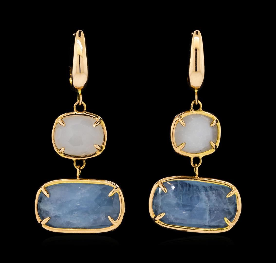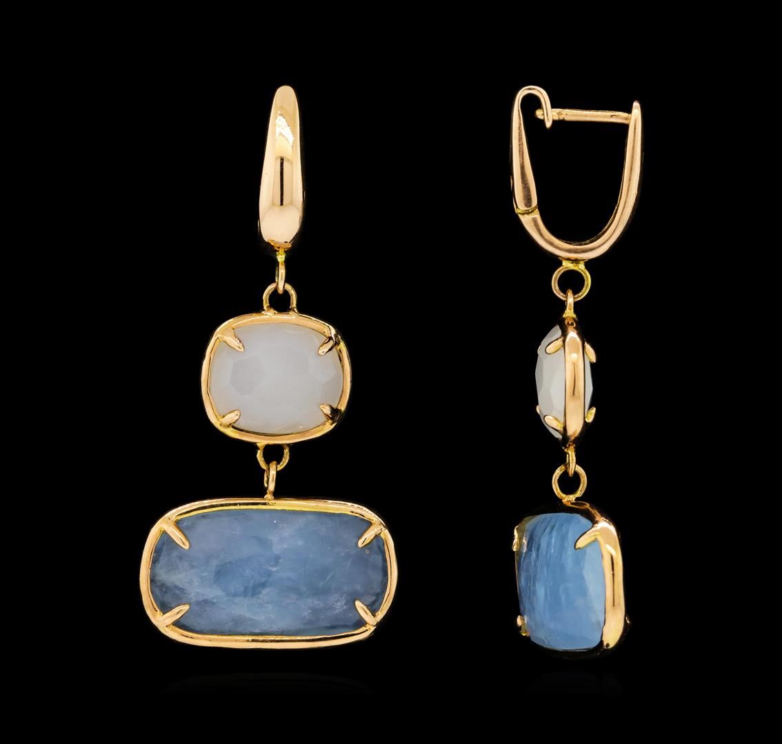 One pair of Ladies dangle earrings featuring: 14KT rose gold weighing 8.3 grams containing faceted blue and white gemstones. The earrings have a drop of 42 millimeters.