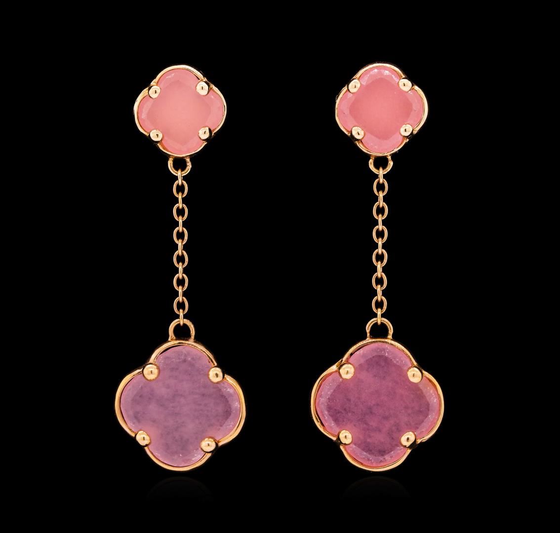 One pair of Ladies four leaf clover earrings featuring: 14KT rose gold weighing 6.1 grams containing four rose quartz. The earrings have a drop of 45 millimeters.