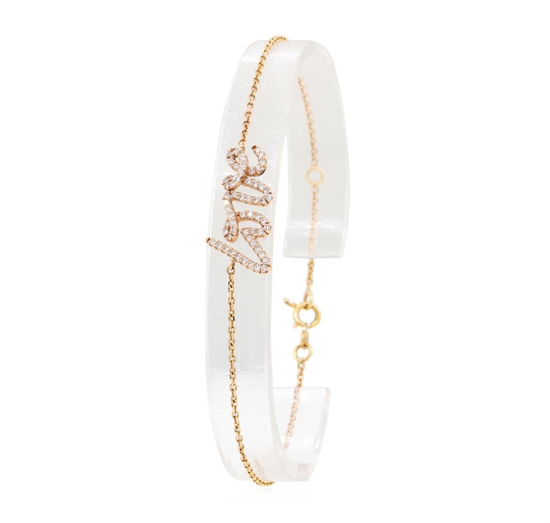 One "Love" script bracelet featuring: 14KT rose gold weighing 2.4 grams containing diamonds weighing 0.30ctw. The bracelet can be worn between seven to seven and a half inches in length.