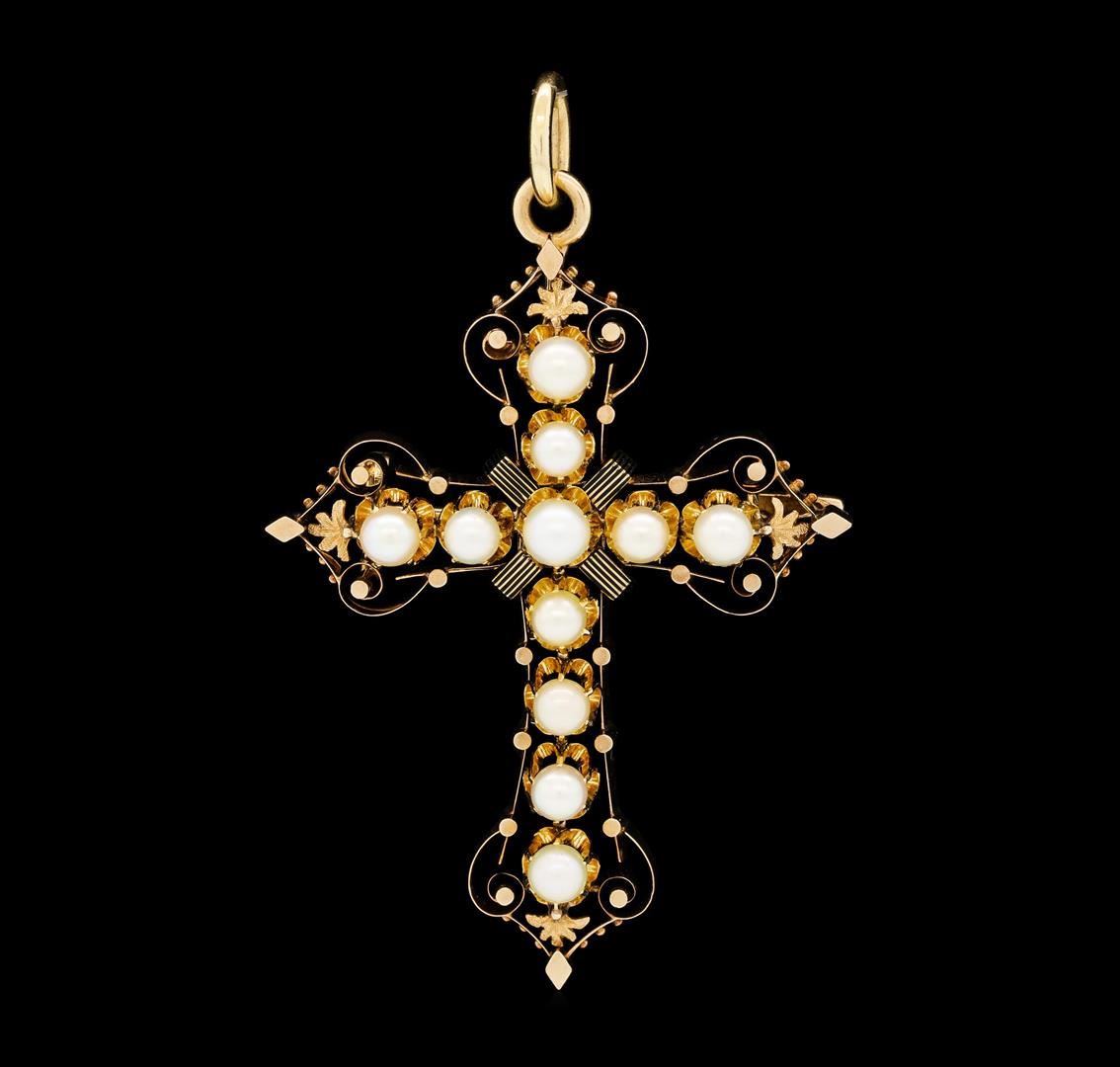 One electronically tested 14KT rose gold lady's hand fabricated cross shape pendant-pin with a bright polish finish. The featured lady's pendant-pin has a folding bail and inlaid black enamel. Condition is like new, good workmanship. Containing: Eleven akoya cultured pearls, 4.8mm to 4.0mm in size. The pearls are light cream in color with a good luster, round, and clean with excellent matching. Graded in the setting.. Total Weight of Pendant-Pin 14.20gm. GAS Appraised.