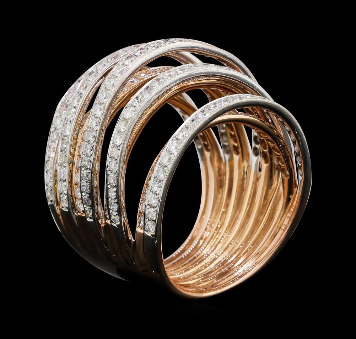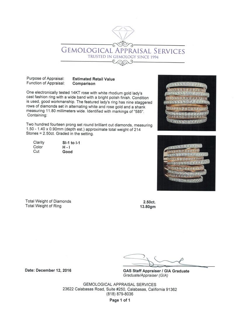 One electronically tested 14KT rose with white rhodium gold lady's cast fashion ring with a wide band with a bright polish finish. The featured lady's ring has nine staggered rows of diamonds set in alternating white and rose gold and a shank measuring 11.80 millimeters wide. Identified with markings of "585". Condition is used, good workmanship. Containing: Two Hundred Fourteen prong set round brilliant cut diamonds, measuring 1.50 - 1.40 x 0.90mm (depth est.) approximate total weight of 214 Stones = 2.50ct. Graded in the setting. Clarity: SI-1 to I-1. Color: H - ICut Good. Total Weight of Diamonds 2.50ct. Total Weight of Ring 13.80gm. GAS Appraised.