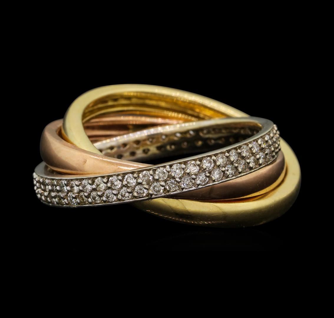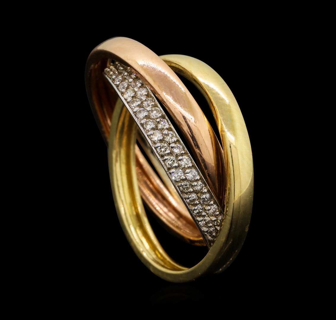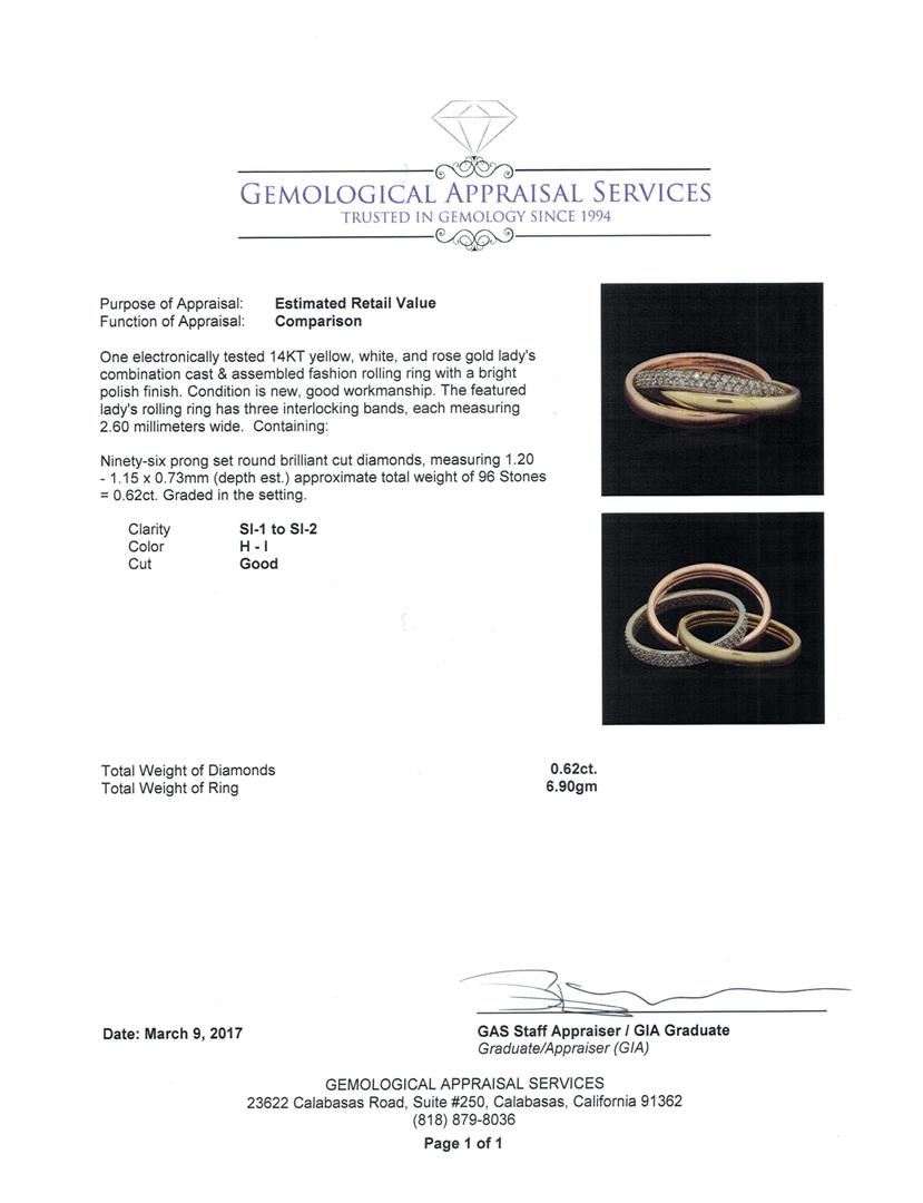 One electronically tested 14KT yellow, white, and rose gold lady's combination cast & assembled fashion rolling ring with a bright polish finish. The featured lady's rolling ring has three interlocking bands, each measuring 2.60 millimeters wide. Condition is new, good workmanship. Containing: Ninety-Six prong set round brilliant cut diamonds, measuring 1.20 - 1.15 x 0.73mm (depth est.) approximate total weight of 96 Stones = 0.62ct. Graded in the setting. Color H - I Clarity SI-1 to SI-2 Cut Good. Total Weight of Diamonds 0.62ct. Total Weight of Ring 6.90gm. GAS Appraised.
