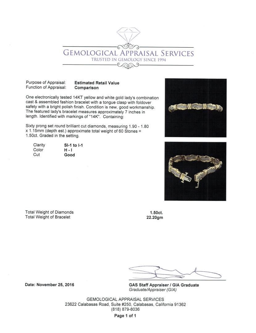 One electronically tested 14KT yellow and white gold lady's combination cast & assembled fashion bracelet with a tongue clasp with fold over safety with a bright polish finish. The featured lady's bracelet measures approximately 7 inches in length. Identified with markings of "14K". Condition is new, good workmanship. Containing: Sixty prong set round brilliant cut diamonds, measuring 1.90 - 1.80 x 1.15mm (depth est.) approximate total weight of 60 Stones = 1.50ct. Graded in the setting. Clarity: SI-1 to I-1. Color: H - ICut Good. Total Weight of Diamonds 1.50ct. Total Weight of Bracelet 22.20gm. GAS Appraised.