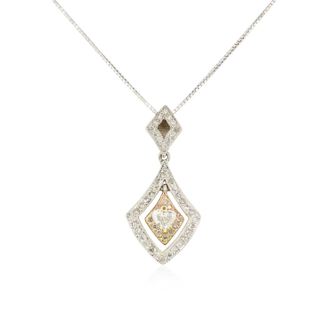 One electronically tested 14KT rose and white gold lady's combination cast & assembled dangle pendant & chain 16.0" long, 0.80 mm square box link with a spring ring clasp with a bright polish finish. Identified with markings of "14K". Condition is new, good workmanship. Containing: One prong set heart shaped cut diamond, measuring 3.00 x 3.90 x 2.46mm (depth est.) approximate weight of 0.17ct. Graded in the setting. Clarity: SI-2. Color: Good Fifty-Four bead set round brilliant cut diamonds, measuring 1.10 - 0.95 x 0.67mm (depth est.) approximate total weight of 54 Stones = 0.23ct. Graded in the setting. Clarity: SI-2 to I-2. Color: I - Good. Total Weight of Diamonds 0.40ct. Total Weight of Pendant & Chain 2.40gm. GAS Appraised at $2,015.00.