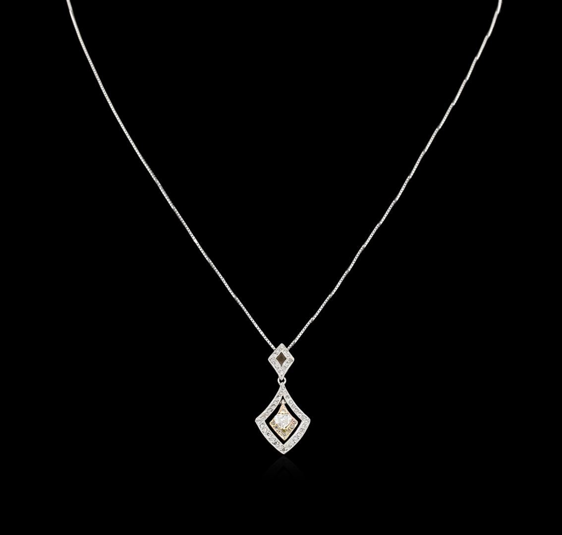 One electronically tested 14KT rose and white gold lady's combination cast & assembled dangle pendant & chain 16.0" long, 0.80 mm square box link with a spring ring clasp with a bright polish finish. Identified with markings of "14K". Condition is new, good workmanship. Containing: One prong set heart shaped cut diamond, measuring 3.00 x 3.90 x 2.46mm (depth est.) approximate weight of 0.17ct. Graded in the setting. Clarity: SI-2. Color: Good Fifty-Four bead set round brilliant cut diamonds, measuring 1.10 - 0.95 x 0.67mm (depth est.) approximate total weight of 54 Stones = 0.23ct. Graded in the setting. Clarity: SI-2 to I-2. Color: I - Good. Total Weight of Diamonds 0.40ct. Total Weight of Pendant & Chain 2.40gm. GAS Appraised at $2,015.00.