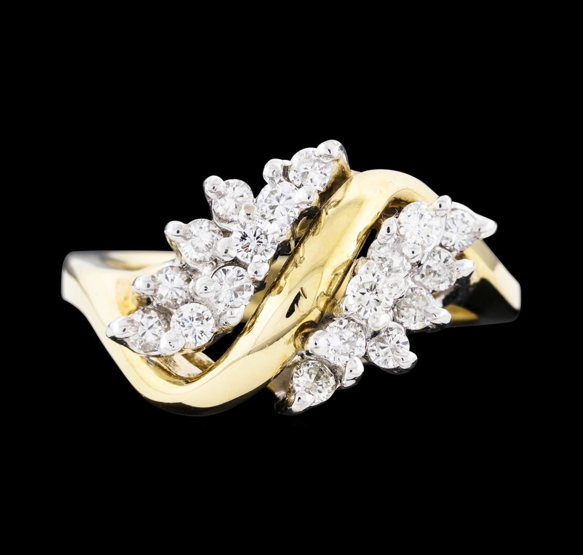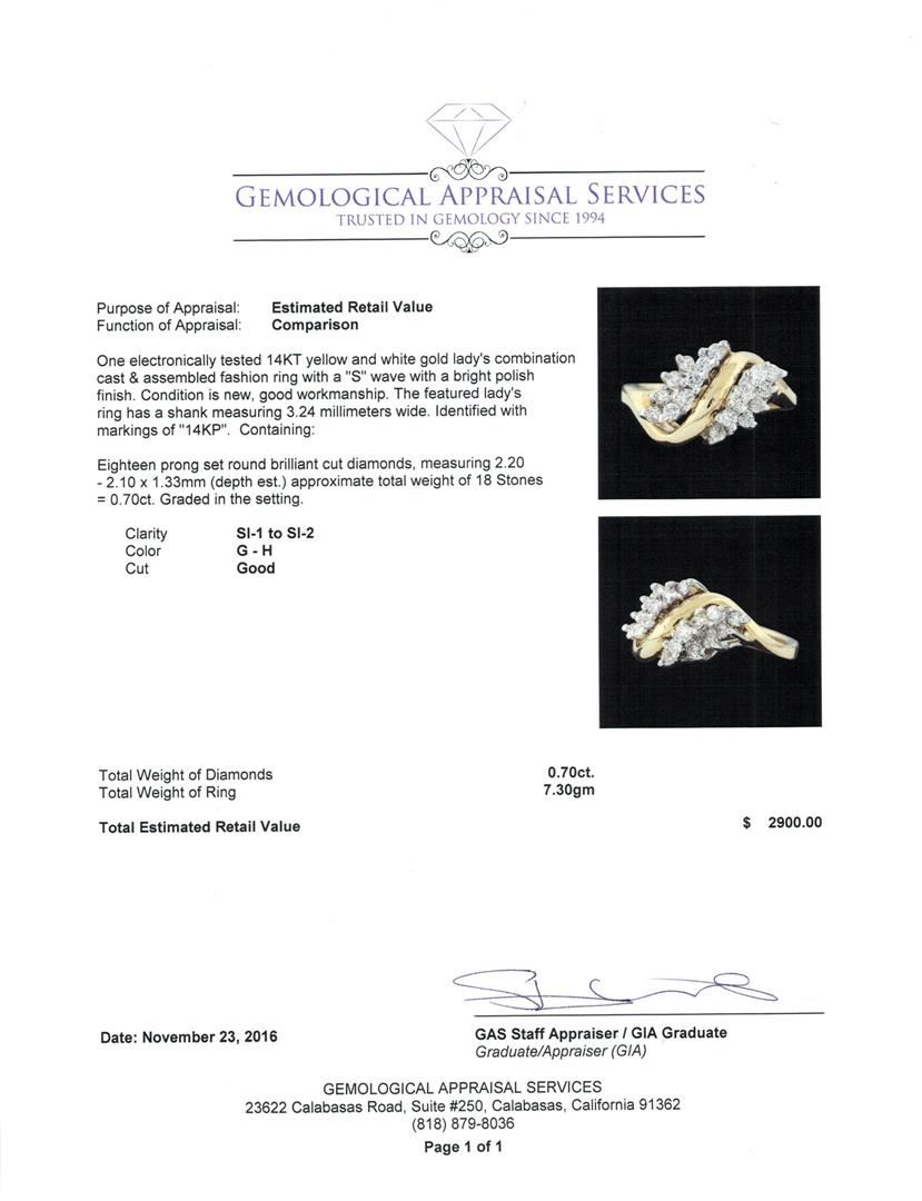 One electronically tested 14KT yellow and white gold lady's combination cast & assembled fashion ring with a "S" wave with a bright polish finish. The featured lady's ring has a shank measuring 3.24 millimeters wide. Identified with markings of "14KP". Condition is new, good workmanship. Containing: Eighteen prong set round brilliant cut diamonds, measuring 2.20 - 2.10 x 1.33mm (depth est.) approximate total weight of 18 Stones = 0.70ct. Graded in the setting. Clarity: SI-1 to SI-2. Color: G - HCut Good. Total Weight of Diamonds 0.70ct. Total Weight of Ring 7.30gm. GAS Appraised at $2,900.00.