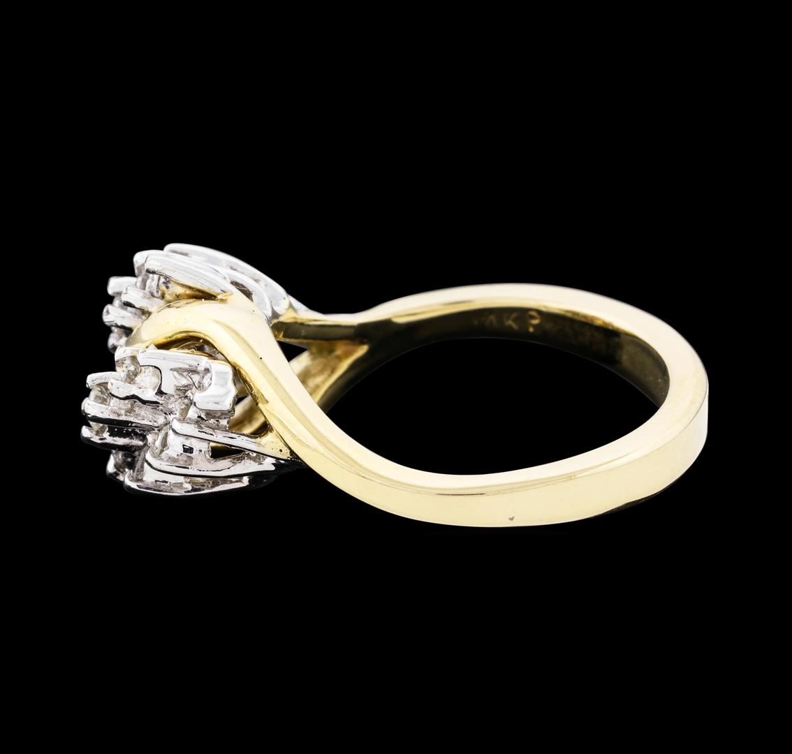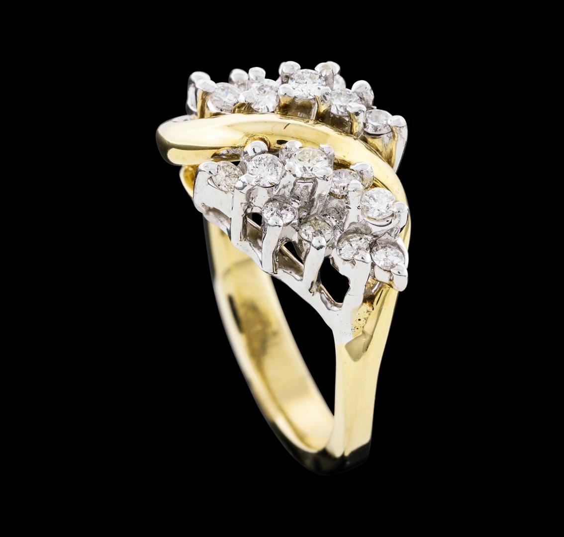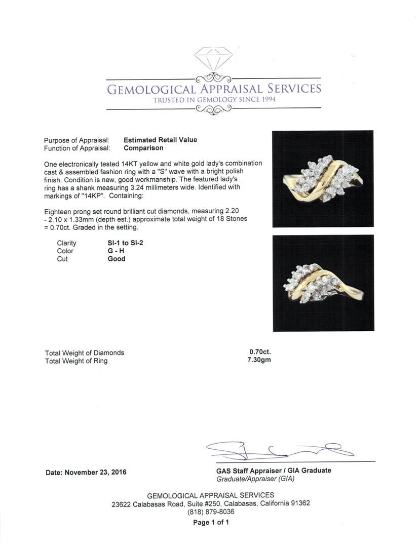 One electronically tested 14KT yellow and white gold lady's combination cast & assembled fashion ring with a "S" wave with a bright polish finish. The featured lady's ring has a shank measuring 3.24 millimeters wide. Identified with markings of "14KP". Condition is new, good workmanship. Containing: Eighteen prong set round brilliant cut diamonds, measuring 2.20 - 2.10 x 1.33mm (depth est.) approximate total weight of 18 Stones = 0.70ct. Graded in the setting. Clarity: SI-1 to SI-2. Color: G - HCut Good. Total Weight of Diamonds 0.70ct. Total Weight of Ring 7.30gm. GAS Appraised.