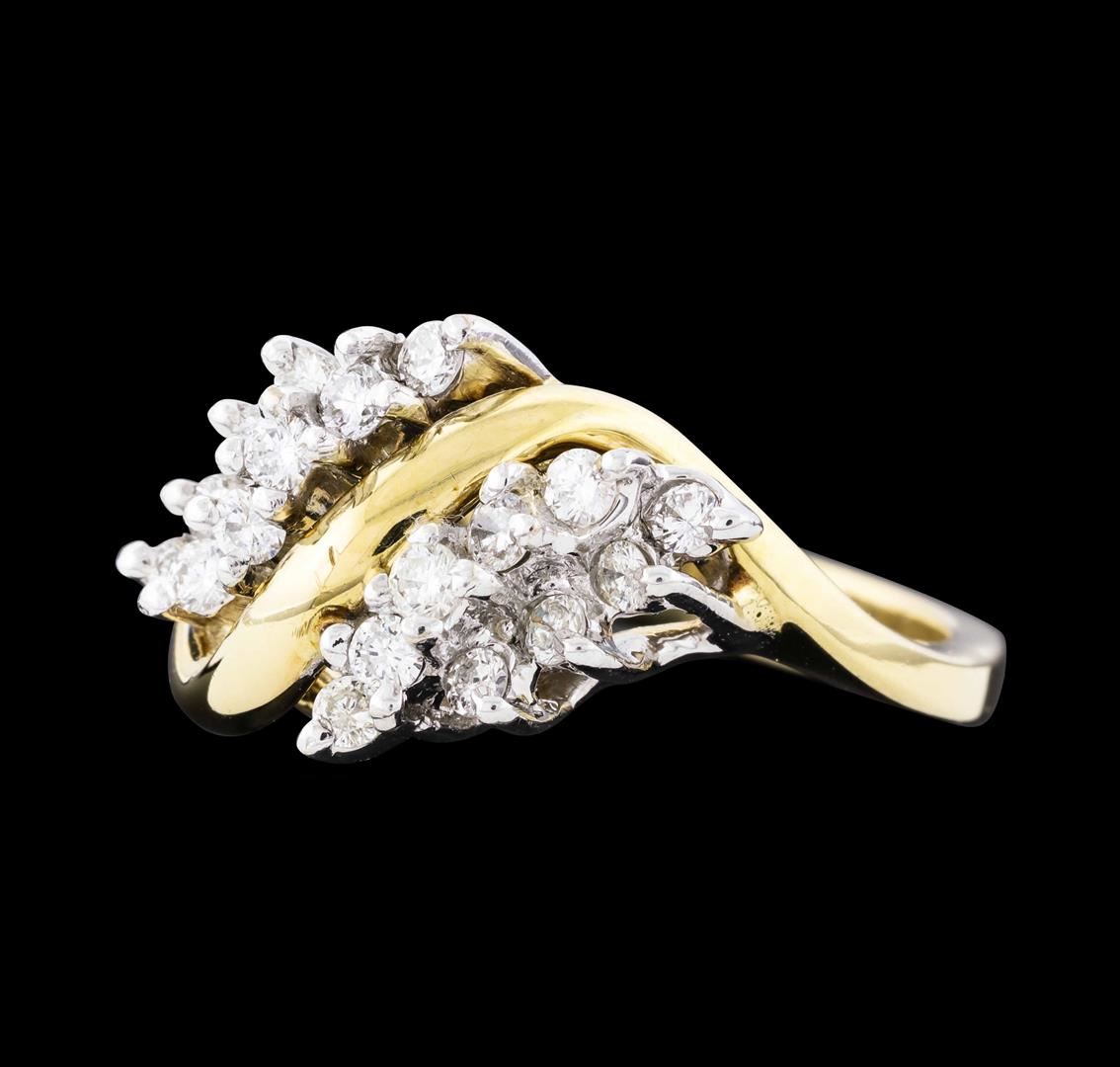 One electronically tested 14KT yellow and white gold lady's combination cast & assembled fashion ring with a "S" wave with a bright polish finish. The featured lady's ring has a shank measuring 3.24 millimeters wide. Identified with markings of "14KP". Condition is new, good workmanship. Containing: Eighteen prong set round brilliant cut diamonds, measuring 2.20 - 2.10 x 1.33mm (depth est.) approximate total weight of 18 Stones = 0.70ct. Graded in the setting. Clarity: SI-1 to SI-2. Color: G - HCut Good. Total Weight of Diamonds 0.70ct. Total Weight of Ring 7.30gm. GAS Appraised.