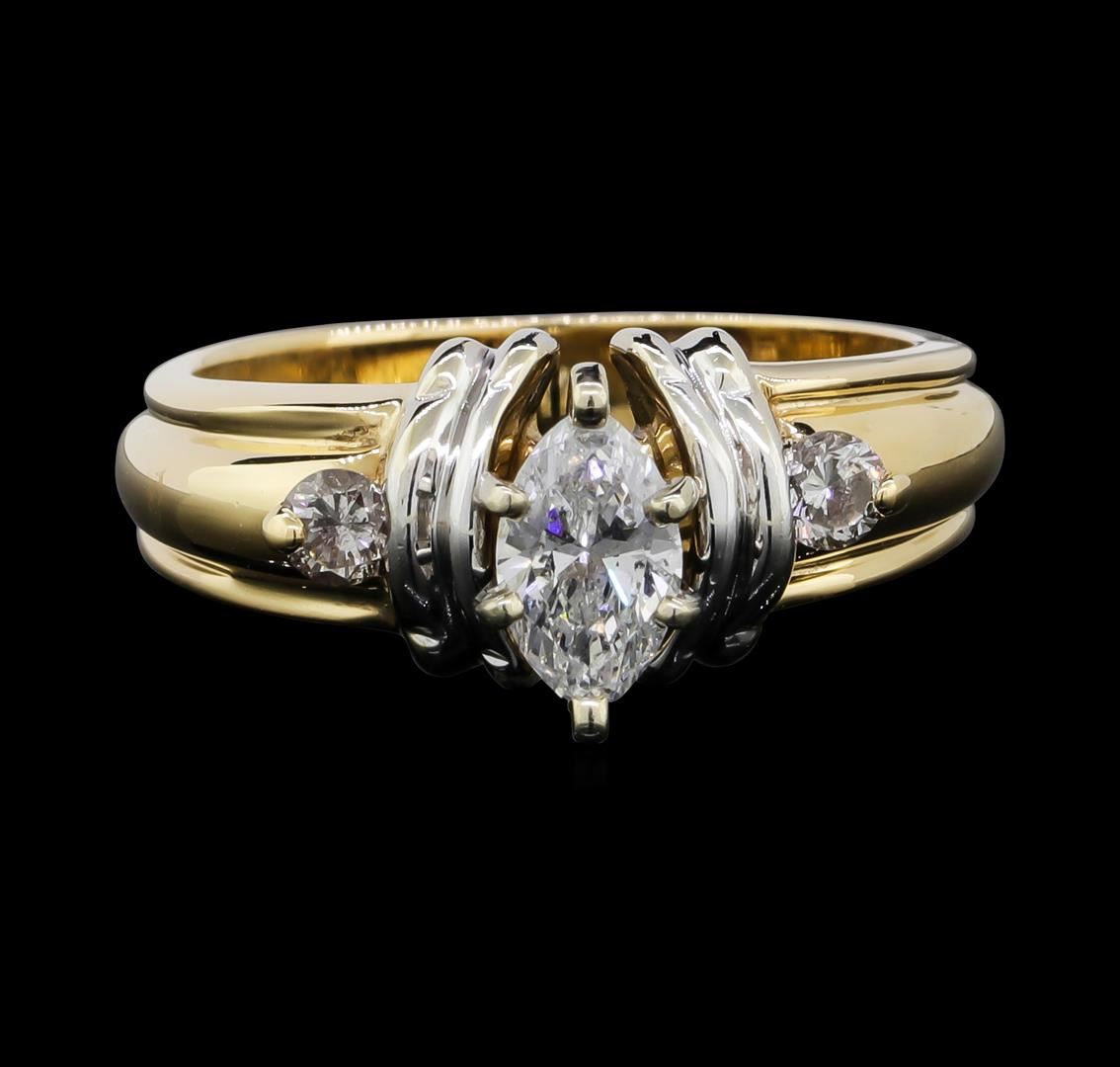 One electronically tested 14KT yellow and white gold lady's combination cast & assembled wedding ring with a straight line three stone motif with a bright polish finish. The featured lady's ring has white gold cuffs and a shank measuring 3.90 millimeters wide. Identified with markings of "14K". Condition is like new, good workmanship. Containing: One prong set marquise shaped cut diamond, measuring 7.75 x 4.32 x 3.10mm (depth est.) approximate weight of 0.60ct. Graded in the setting. Clarity: SI-2. Color: F - GCut Very Good Two prong set round brilliant cut diamonds, measuring 2.80 - 2.75 x 1.67mm (depth est.) approximate total weight of 2 Stones = 0.16ct. Graded in the setting. Clarity: SI-2. Color: H - ICut Good. Total Weight of Diamonds 0.76ct. Total Weight of Ring 6.80gm. GAS Appraised at $4,860.00.