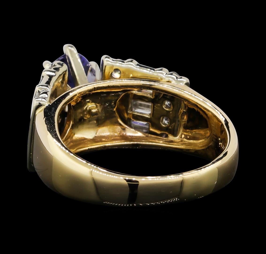 One electronically tested 14KT yellow and white gold lady's combination cast & assembled fashion ring with a cathedral shank with a bright polish finish. The featured lady's ring has a shank measuring 3.26 millimeters wide. Identified with markings of "14K". Condition is new, good workmanship. Containing: One prong set oval modified brilliant cut natural tanzanite, measuring 8.00 x 5.95 x 3.30mm, (depth est.) approximate weight of 1.11ct., clarity is eye clean, medium, moderately strong, violetish blue color, (GIA vB 5/4), cut is very good. Transmitting light with no distortion, transparent. Colored gemstones are presumed to have been subjected to commonly used enhancement processes. Graded in the setting. Sixteen channel set round brilliant cut diamonds, measuring 2.30 - 2.20 x 1.40mm (depth est.) approximate total weight of 16 Stones = 0.70ct. Graded in the setting. Clarity: SI-1 to SI-2. Color: I - JCut Good Sixteen channel set baguette cut diamonds, measuring from 2.90 x 1.10 x 0.94mm (depth est.) to 3.00 x 1.20 x 1.02mm (depth est.) approximate total weight of 16 Stones = 0.50ct. Graded in the setting. Clarity: VS-1 to VS-2. Color: H - ICut Good. Total Weight of Colored Stones 1.11ct. Total Weight of Diamonds 1.20ct. Total Weight of Ring 8.30gm. GAS Appraised.