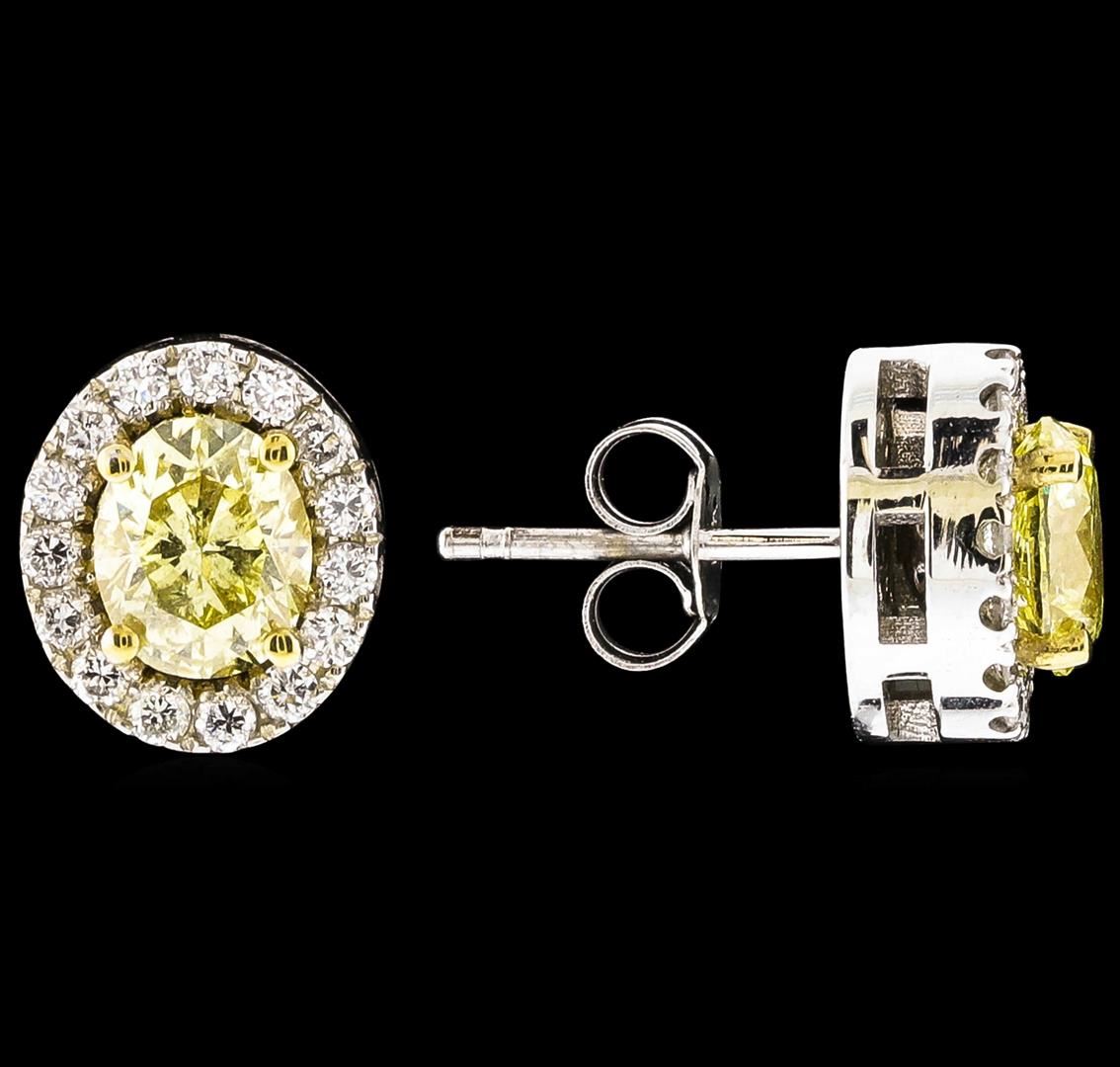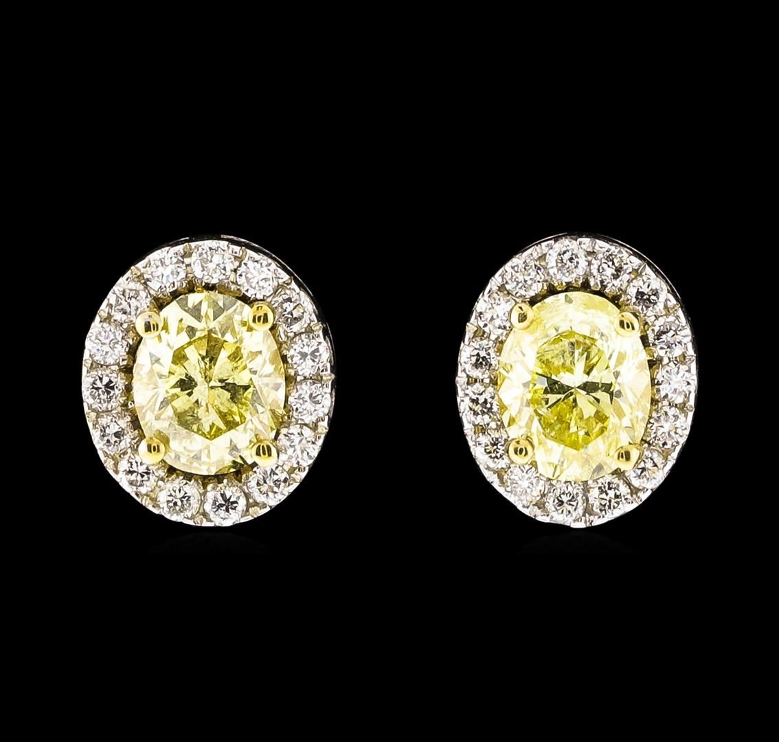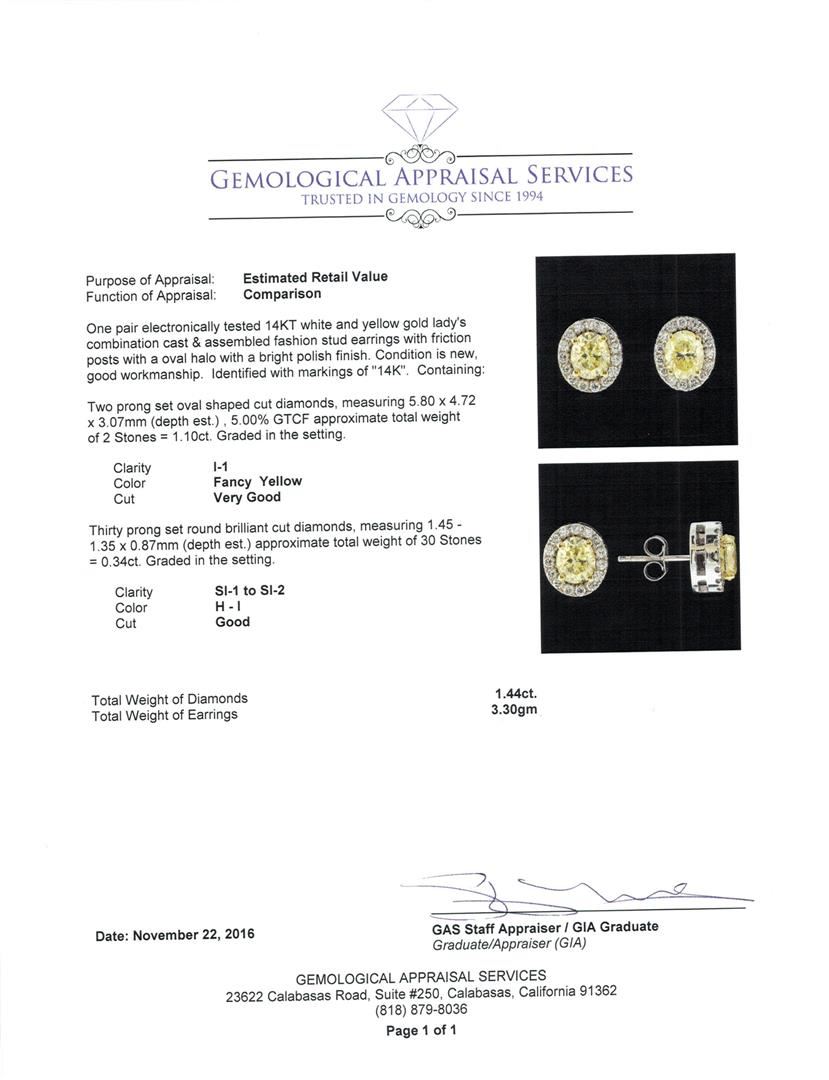 One pair electronically tested 14KT white and yellow gold lady's combination cast & assembled fashion stud earrings with friction posts with a oval halo with a bright polish finish. Identified with markings of "14K". Condition is new, good workmanship. Containing: Two prong set oval shaped cut diamonds, measuring 5.80 x 4.72 x 3.07mm (depth est.) , 5.00.%. GTCF approximate total weight of 2 Stones = 1.10ct. Graded in the setting. Clarity: I-1 Cut Very Good Thirty prong set round brilliant cut diamonds, measuring 1.45 - 1.35 x 0.87mm (depth est.) approximate total weight of 30 Stones = 0.34ct. Graded in the setting. Clarity: SI-1 to SI-2. Color: H - ICut Good. Total Weight of Diamonds 1.44ct. Total Weight of Earrings 3.30gm. GAS Appraised.