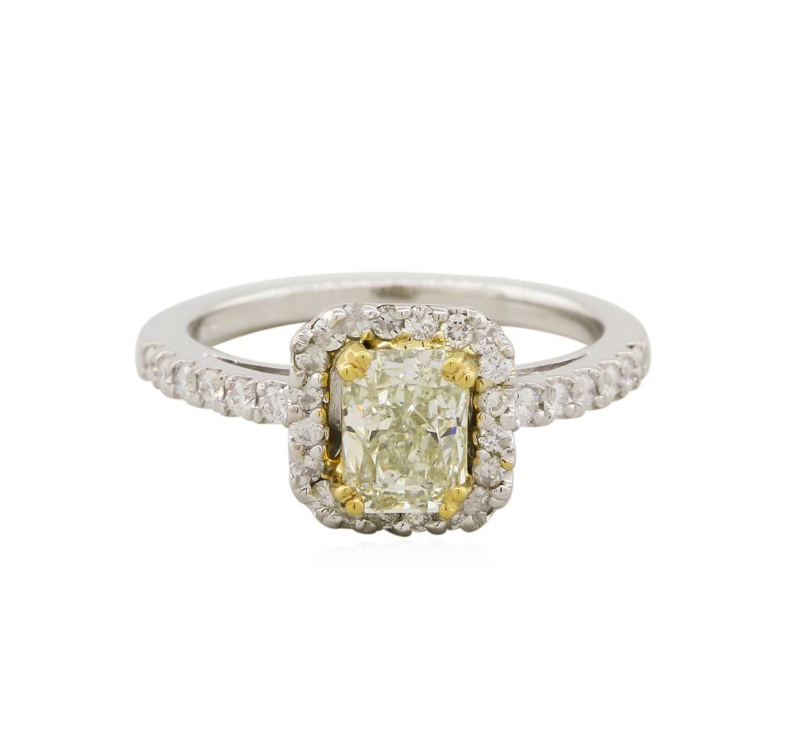 One electronically tested 14KT white and yellow gold lady's combination cast & assembled wedding ring with a cathedral shank with a bright polish finish. The featured lady's ring has a shank measuring 1.62 millimeters wide. Identified with markings of "14K". Condition is new, good workmanship. Containing: One prong set radiant shaped cut diamond, measuring 6.49 x 4.82 x 3.62mm (depth est.) , 10.00.%. GTCF approximate weight of 1.02ct. Graded in the setting. Clarity: SI-1 Cut Very Good Twelve prong set round brilliant cut diamonds, measuring 1.60 - 1.55 x 1.00mm (depth est.) approximate total weight of 12 Stones = 0.19ct. Graded in the setting. Clarity: SI-1 to I-1. Color: G - Good Twenty prong set round brilliant cut diamonds, measuring 1.50 - 1.45 x 0.93mm (depth est.) approximate total weight of 20 Stones = 0.26ct. Graded in the setting. Clarity: SI-1 to I-1. Color: H - I. Cut Good. Total Weight of Diamonds 1.47ct. Total Weight of Ring 4.20gm. GAS Appraised at $10,705.00.