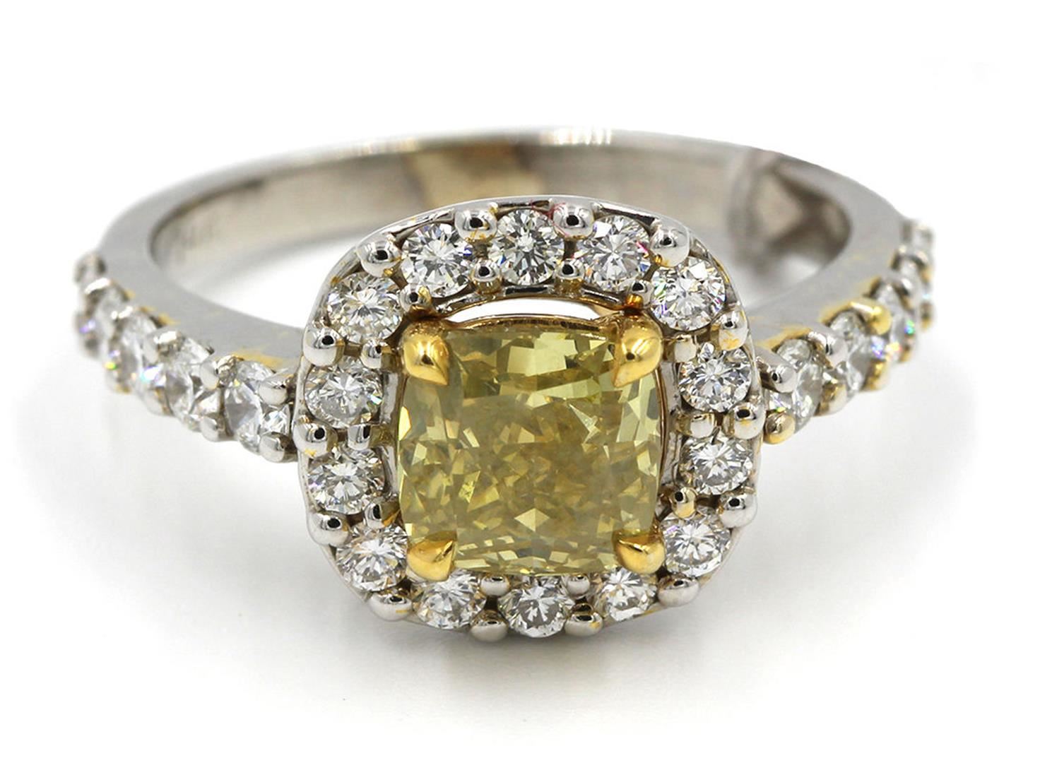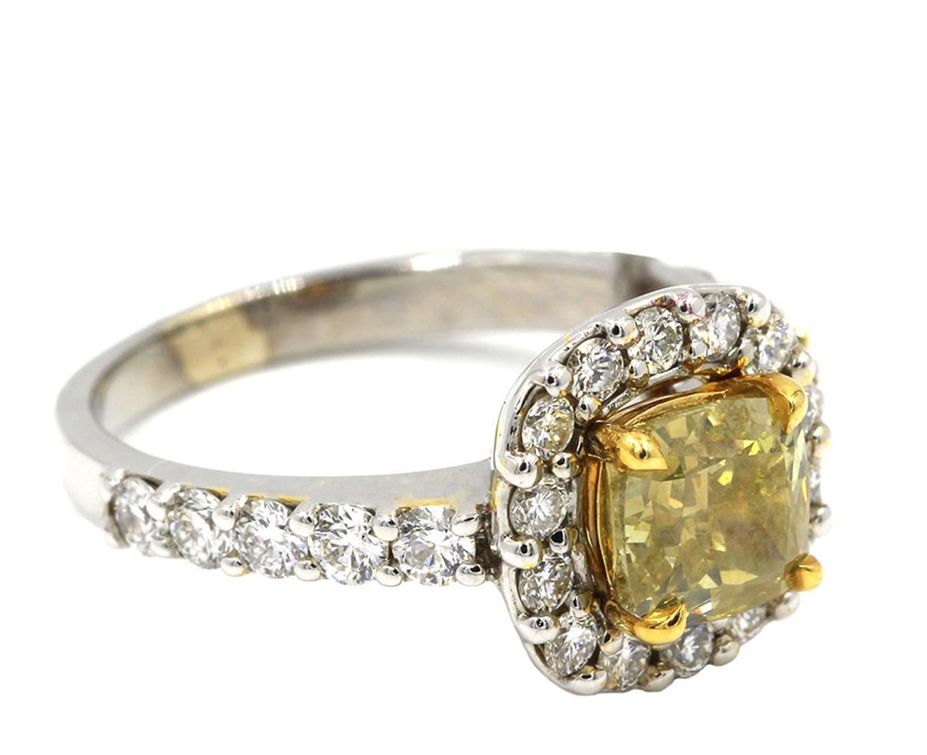 One Natural Halo Fancy Yellow Cushion & Round Diamond Engagement Ring in 14k White & Yellow old. Total carat weight is 2.24. Gross weight is 5.18 grams with a total of 17 stones. Size 7 however can be resized free of charge. Condition is brand new. Main stone is non-enhanced and natural. Main diamond is 1.63 carats, shape cushion cut, clarity SI-1. Color natural fancy yellow (even distribution), and cut is very good. Side stone is non-enhanced and natural and is 0.61 carats. Side diamond shape is brilliant round cut, clarity VS-1 / SI-1, color G, diamond cut very good with a total of 16 side diamonds.