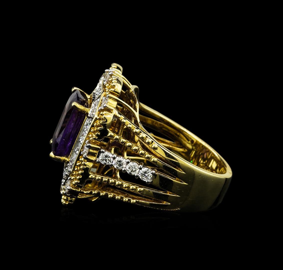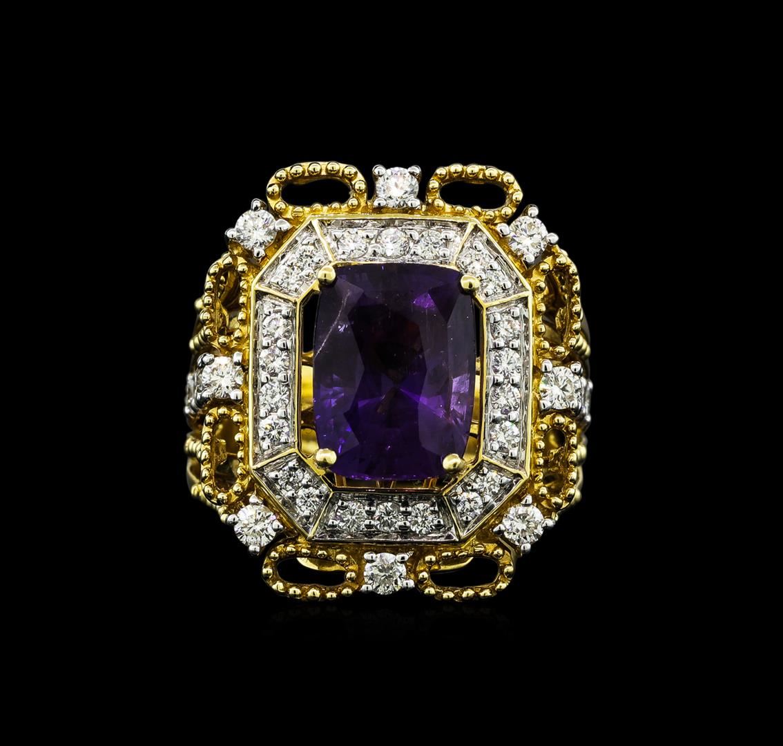 One electronically tested 14KT yellow and white gold lady's combination cast & assembled fashion ring with a tapered shank with halo with a bright polish with milgrain detailing finish. The featured lady's ring has a shank measuring 5.60 millimeters wide. Identified with markings of "14K". Condition is new, good workmanship. Containing: One prong set rectangular cushion modified mixed cut natural purple sapphire, measuring 10.72 x 8.02 x 6.26mm, (depth est.) approximate weight of 4.87ct., clarity is slightly included, medium, moderately strong, purple color, (GIA P 5/4), cut is very good. Transmitting light with a minimum of distortion, transparent. No indications of heat treatment. Colored gemstones are presumed to have been subjected to commonly used enhancement processes. Graded loose prior to setting in the TGL Laboratory, Report #25050228.Sixteen prong set round brilliant cut diamonds, measuring 2.20 - 2.10 x 1.33mm (depth est.) approximate total weight of 16 Stones = 0.63ct. Graded in the setting. Clarity: VS-1 to SI-1. Color: F - GCut Very Good Twenty-Two bead set round brilliant cut diamonds, measuring 1.60 - 1.50 x 0.96mm (depth est.) approximate total weight of 22 Stones = 0.31ct. Graded in the setting. Clarity: VS-2 to SI-1. Color: G - HCut Very Good. Total Weight of Colored Stones 4.87ct. Total Weight of Diamonds 0.94ct. Total Weight of Ring 11.30gm. GAS Appraised.