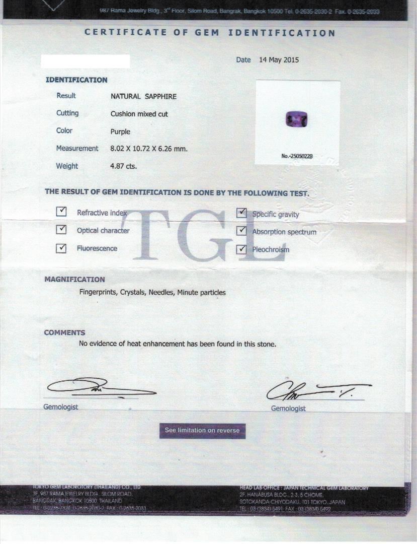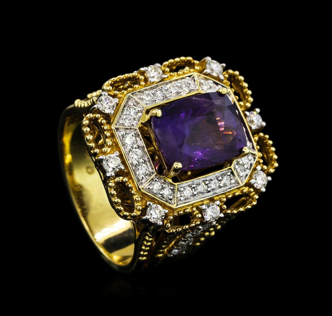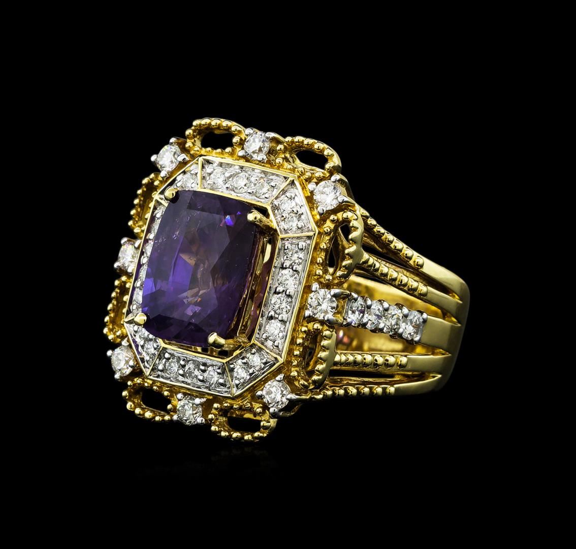 One electronically tested 14KT yellow and white gold lady's combination cast & assembled fashion ring with a tapered shank with halo with a bright polish with milgrain detailing finish. The featured lady's ring has a shank measuring 5.60 millimeters wide. Identified with markings of "14K". Condition is new, good workmanship. Containing: One prong set rectangular cushion modified mixed cut natural purple sapphire, measuring 10.72 x 8.02 x 6.26mm, (depth est.) approximate weight of 4.87ct., clarity is slightly included, medium, moderately strong, purple color, (GIA P 5/4), cut is very good. Transmitting light with a minimum of distortion, transparent. No indications of heat treatment. Colored gemstones are presumed to have been subjected to commonly used enhancement processes. Graded loose prior to setting in the TGL Laboratory, Report #25050228.Sixteen prong set round brilliant cut diamonds, measuring 2.20 - 2.10 x 1.33mm (depth est.) approximate total weight of 16 Stones = 0.63ct. Graded in the setting. Clarity: VS-1 to SI-1. Color: F - GCut Very Good Twenty-Two bead set round brilliant cut diamonds, measuring 1.60 - 1.50 x 0.96mm (depth est.) approximate total weight of 22 Stones = 0.31ct. Graded in the setting. Clarity: VS-2 to SI-1. Color: G - HCut Very Good. Total Weight of Colored Stones 4.87ct. Total Weight of Diamonds 0.94ct. Total Weight of Ring 11.30gm. GAS Appraised.