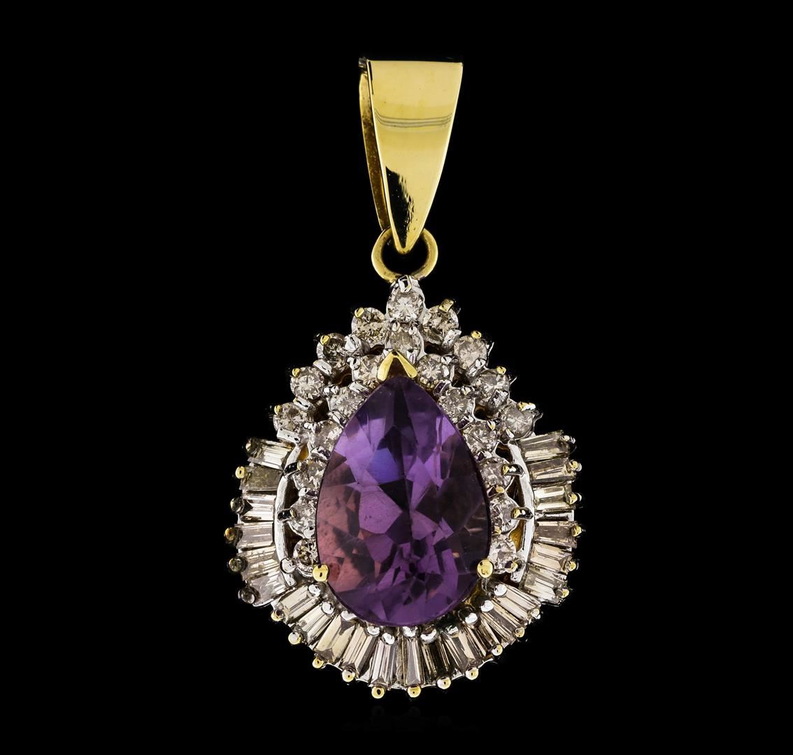 One 14KT Two Tone Gold 6.90ct Amethyst and Diamond Pendant with a total weight of 9.2 grams. Amethyst with a total weight of 6.9cts. (22) round diamonds with a total weight of 0.77cts with a color of (J) and clarity of I-1. (23) baguette diamonds with a total weight of 1.38cts with a light brown color and clarity of SI-1.