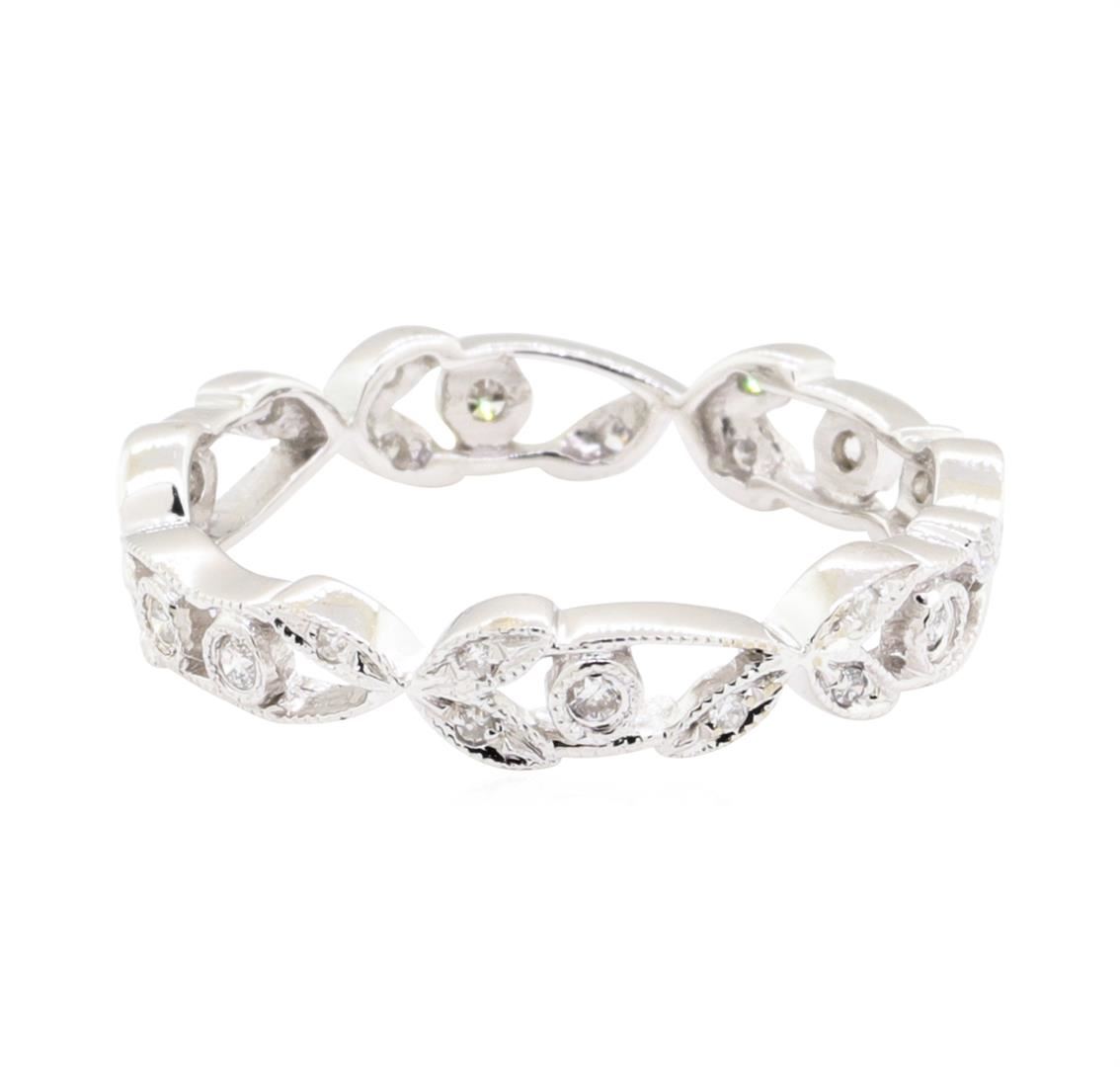 One floral motif eternity ring featuring: 14KT white gold weighing 1.6 grams containing diamonds weighing 0.15ctw. The ring is a size 5.
