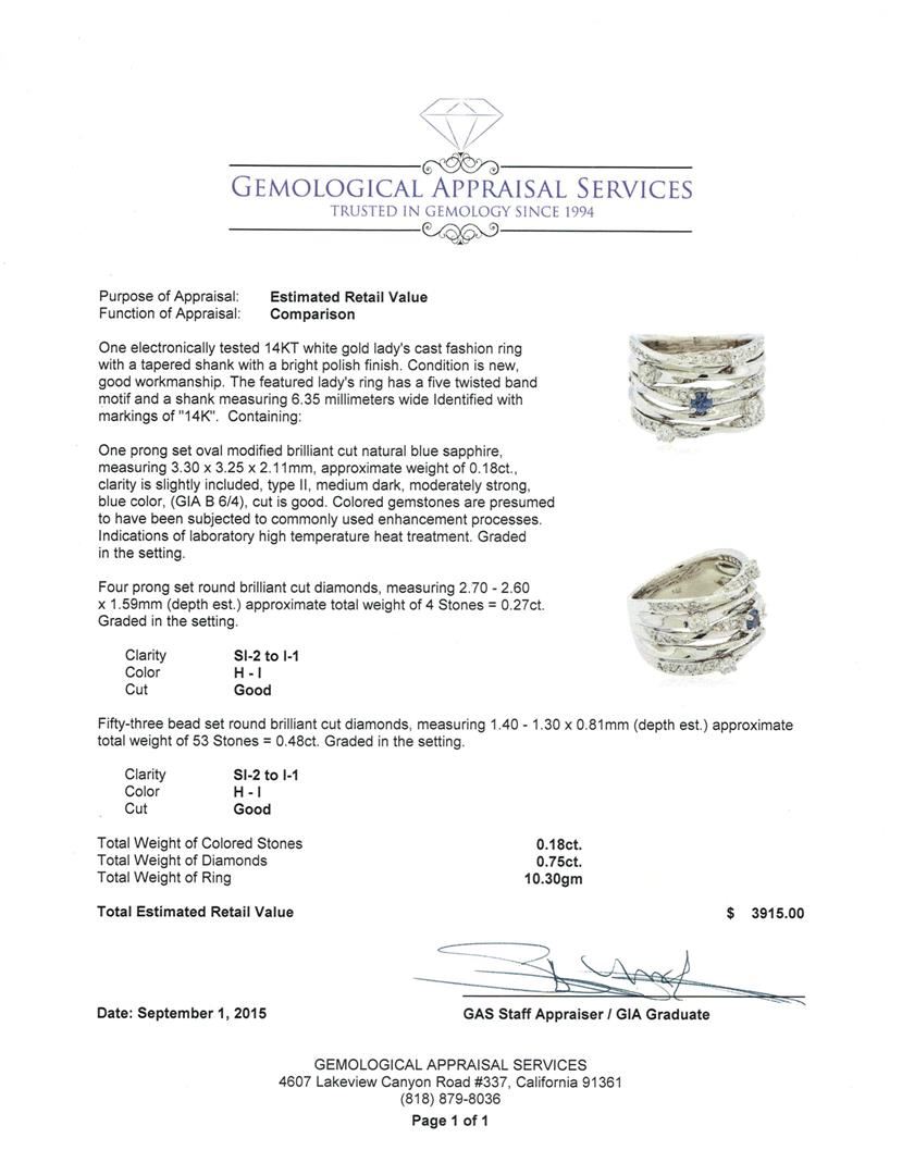 One electronically tested 14KT white gold lady's cast fashion ring with a tapered shank with a bright polish finish. The featured lady's ring has a five twisted band motif and a shank measuring 6.35 millimeters wide Identified with markings of "14K". Condition is new, good workmanship. Containing: One prong set oval modified brilliant cut natural blue sapphire, measuring 3.30 x 3.25 x 2.11mm, approximate weight of 0.18ct., clarity is slightly included, type II, medium dark, moderately strong, blue color, (GIA B 6/4), cut is good. Colored gemstones are presumed to have been subjected to commonly used enhancement processes. Indications of laboratory high temperature heat treatment. Graded in the setting. Four prong set round brilliant cut diamonds, measuring 2.70 - 2.60 x 1.59mm (depth est.) approximate total weight of 4 Stones = 0.27ct. Graded in the setting. Clarity: SI-2 to I-1. Color: H - I. Cut Good Fifty-Three bead set round brilliant cut diamonds, measuring 1.40 - 1.30 x 0.81mm (depth est.) approximate total weight of 53 Stones = 0.48ct. Graded in the setting. Clarity: SI-2 to I-1. Color: H - I. Cut Good. Total Weight of Colored Stones 0.18ct. Total Weight of Diamonds 0.75ct. Total Weight of Ring 10.30gm. GAS Appraised at $3,915.00.