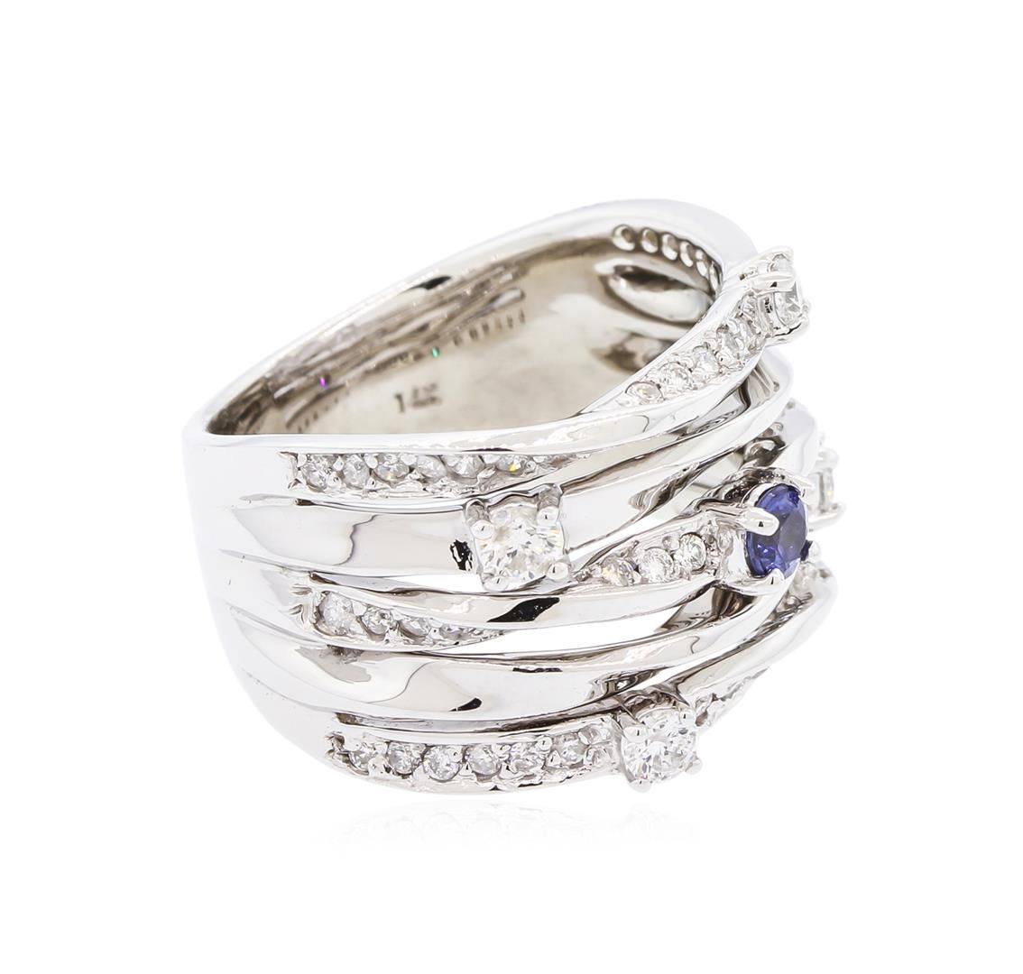 One electronically tested 14KT white gold lady's cast fashion ring with a tapered shank with a bright polish finish. The featured lady's ring has a five twisted band motif and a shank measuring 6.35 millimeters wide Identified with markings of "14K". Condition is new, good workmanship. Containing: One prong set oval modified brilliant cut natural blue sapphire, measuring 3.30 x 3.25 x 2.11mm, approximate weight of 0.18ct., clarity is slightly included, type II, medium dark, moderately strong, blue color, (GIA B 6/4), cut is good. Colored gemstones are presumed to have been subjected to commonly used enhancement processes. Indications of laboratory high temperature heat treatment. Graded in the setting. Four prong set round brilliant cut diamonds, measuring 2.70 - 2.60 x 1.59mm (depth est.) approximate total weight of 4 Stones = 0.27ct. Graded in the setting. Clarity: SI-2 to I-1. Color: H - I. Cut Good Fifty-Three bead set round brilliant cut diamonds, measuring 1.40 - 1.30 x 0.81mm (depth est.) approximate total weight of 53 Stones = 0.48ct. Graded in the setting. Clarity: SI-2 to I-1. Color: H - I. Cut Good. Total Weight of Colored Stones 0.18ct. Total Weight of Diamonds 0.75ct. Total Weight of Ring 10.30gm. GAS Appraised at $3,915.00.