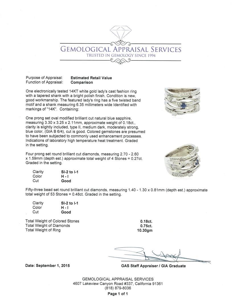 One electronically tested 14KT white gold lady's cast fashion ring with a tapered shank with a bright polish finish. The featured lady's ring has a five twisted band motif and a shank measuring 6.35 millimeters wide Identified with markings of "14K". Condition is new, good workmanship. Containing: One prong set oval modified brilliant cut natural blue sapphire, measuring 3.30 x 3.25 x 2.11mm, approximate weight of 0.18ct., clarity is slightly included, type II, medium dark, moderately strong, blue color, (GIA B 6/4), cut is good. Colored gemstones are presumed to have been subjected to commonly used enhancement processes. Indications of laboratory high temperature heat treatment. Graded in the setting. Four prong set round brilliant cut diamonds, measuring 2.70 - 2.60 x 1.59mm (depth est.) approximate total weight of 4 Stones = 0.27ct. Graded in the setting. Clarity: SI-2 to I-1. Color: H - I. Cut Good Fifty-Three bead set round brilliant cut diamonds, measuring 1.40 - 1.30 x 0.81mm (depth est.) approximate total weight of 53 Stones = 0.48ct. Graded in the setting. Clarity: SI-2 to I-1. Color: H - I. Cut Good. Total Weight of Colored Stones 0.18ct. Total Weight of Diamonds 0.75ct. Total Weight of Ring 10.30gm. GAS Appraised.