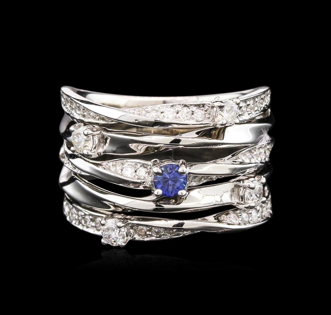 One electronically tested 14KT white gold lady's cast fashion ring with a tapered shank with a bright polish finish. The featured lady's ring has a five twisted band motif and a shank measuring 6.35 millimeters wide Identified with markings of "14K". Condition is new, good workmanship. Containing: One prong set oval modified brilliant cut natural blue sapphire, measuring 3.30 x 3.25 x 2.11mm, approximate weight of 0.18ct., clarity is slightly included, type II, medium dark, moderately strong, blue color, (GIA B 6/4), cut is good. Colored gemstones are presumed to have been subjected to commonly used enhancement processes. Indications of laboratory high temperature heat treatment. Graded in the setting. Four prong set round brilliant cut diamonds, measuring 2.70 - 2.60 x 1.59mm (depth est.) approximate total weight of 4 Stones = 0.27ct. Graded in the setting. Clarity: SI-2 to I-1. Color: H - I. Cut Good Fifty-Three bead set round brilliant cut diamonds, measuring 1.40 - 1.30 x 0.81mm (depth est.) approximate total weight of 53 Stones = 0.48ct. Graded in the setting. Clarity: SI-2 to I-1. Color: H - I. Cut Good. Total Weight of Colored Stones 0.18ct. Total Weight of Diamonds 0.75ct. Total Weight of Ring 10.30gm. GAS Appraised.