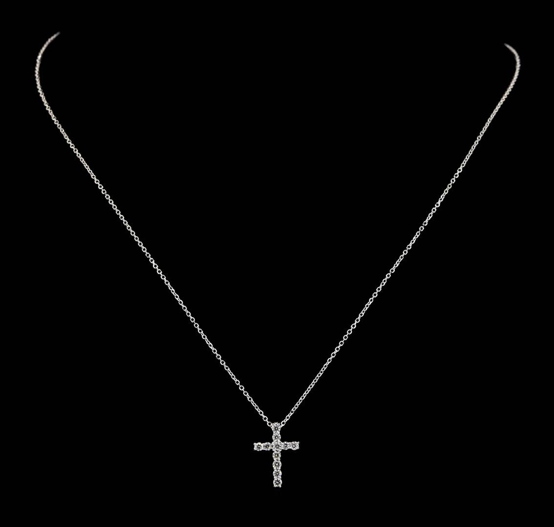 One cross pendant and chain featuring: 14KT white gold weighing 1.5 grams containing diamonds weighing 0.25ctw.