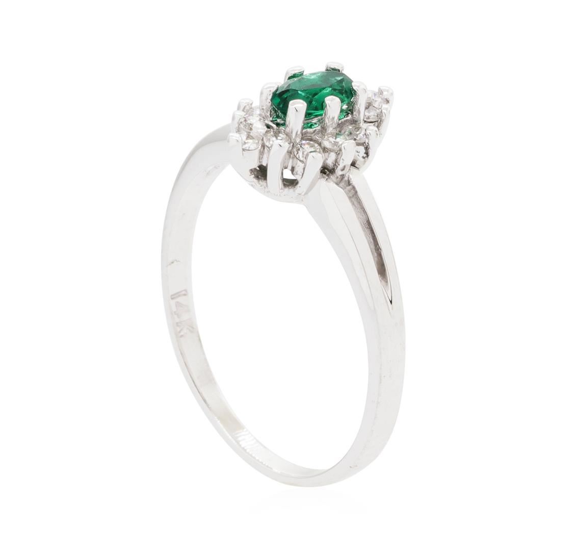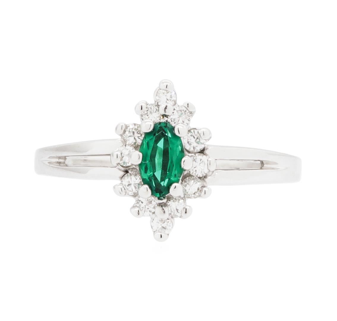 One lady's ring featuring: 14KT white gold weighing 2.3 grams containing one emerald weighing 0.30ct and diamonds weighing 0.12ctw. The ring is a size 6.