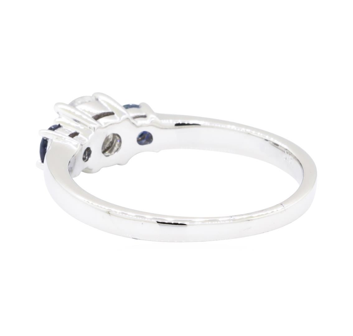 One electronically tested 14KT white gold lady's cast fashion three stone ring with a bright polish finish. The featured lady's ring has a shank measuring 1.77 millimeters wide. Identified with markings of '14K'. Condition is new, good workmanship. Containing: Two prong set round modified mixed cut natural blue sapphires, measuring 3.15 - 3.10 x 2.03 mm, (depth est.) approximate total weight of 0.32ct., clarity is eye clean, medium, very slightly grayish, blue color, (GIA B 5/3), cut is very good. Transmitting light with no distortion, transparent. Colored gemstones are presumed to have been subjected to commonly used enhancement processes. Graded in the setting. One prong set round brilliant cut diamond, measuring 5.18 - 5.13 x 3.20mm (depth est.) approximate weight of 0.52ct. Graded in the setting. Color H - I Clarity SI-2 Cut Very Good. Total Weight of Colored Stones 0.32ct.. Total Weight of Diamonds 0.52ct.. Total Weight of Ring 2.80gm. GAS Appraised.