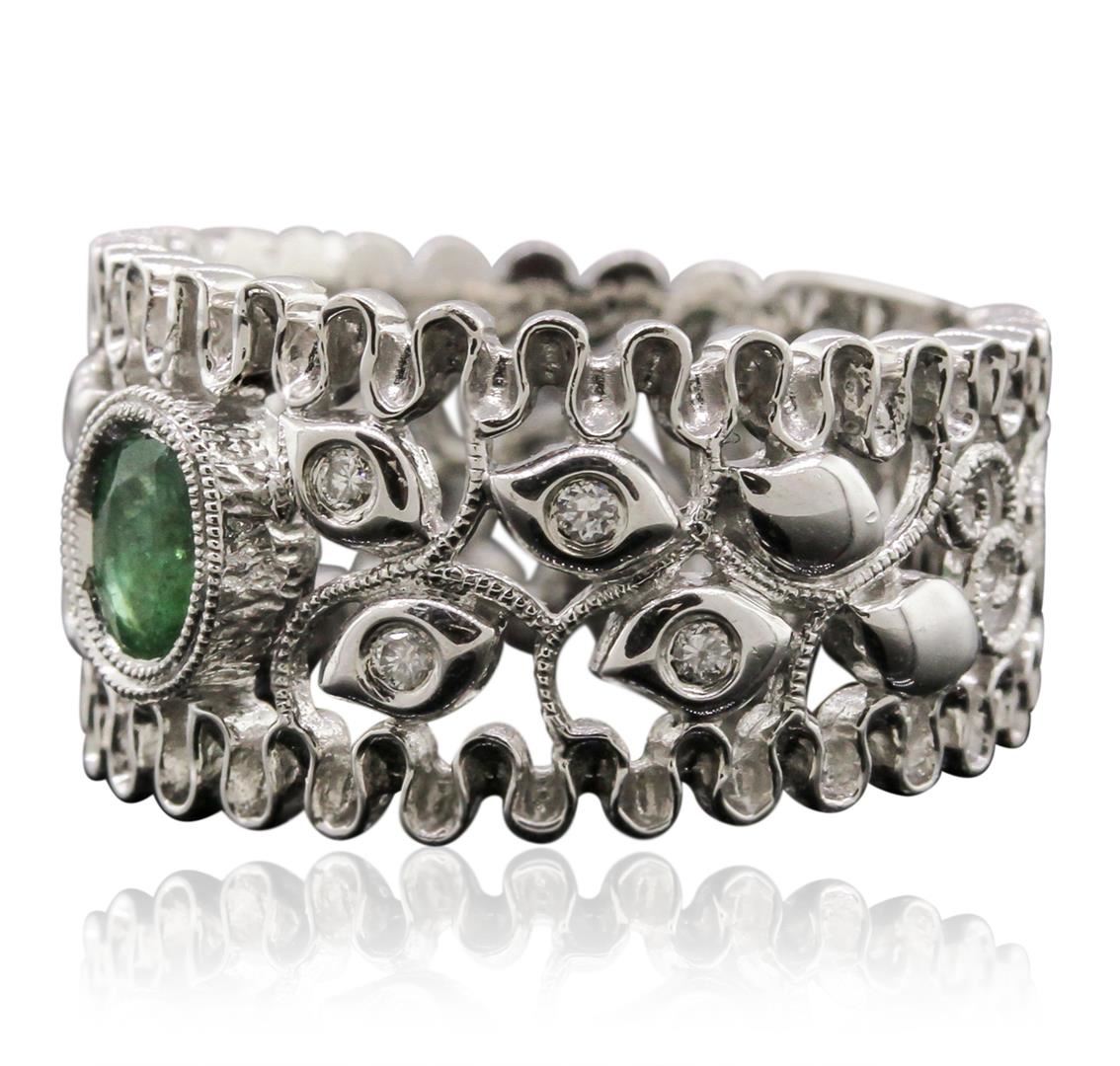 Main gemstone identity emerald (beryl). Mmts 5.88 x 4.61 x 2.50. Carats/count 0.32ct (est)/1. Shape oval (faceted). Color forest green. Quality 6 good-very good. Adjacent gemstones identity diamonds. Mmts 1.50 x 0.80. Carats/count 0.12ctw (est)/8. Cut round (faceted). Color G-H (Avg). Quality SI-2/I-1. Item Ring. Material 14K gold. Color white. Item wt 6.10 grams. Total carats 0.44.
