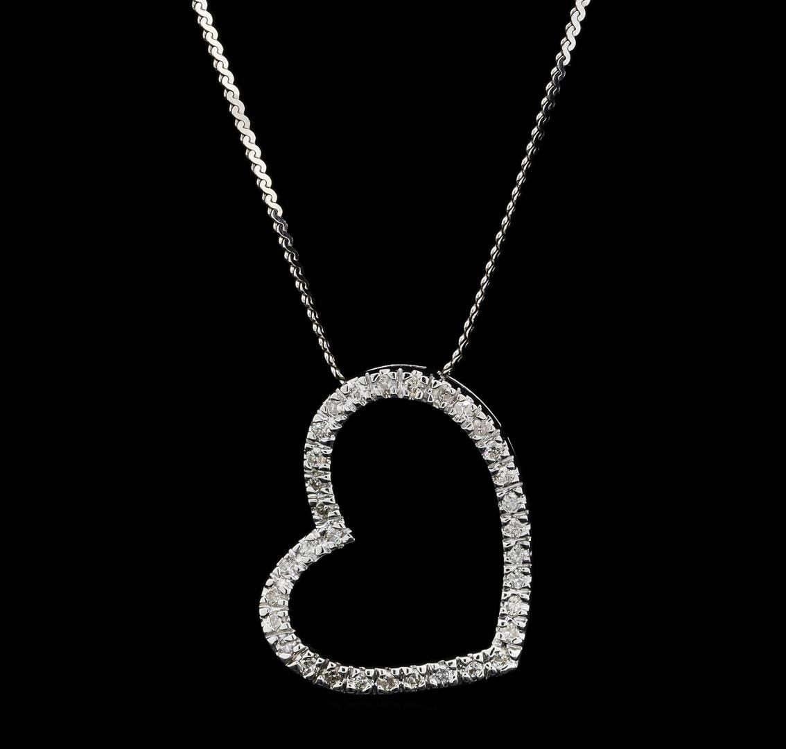 One 14KT White Gold 0.25ctw Diamond Pendant with Chain. 33 diamonds with a total weight of 0.35cts. Total weight of pendant with chain is 6.2 grams.