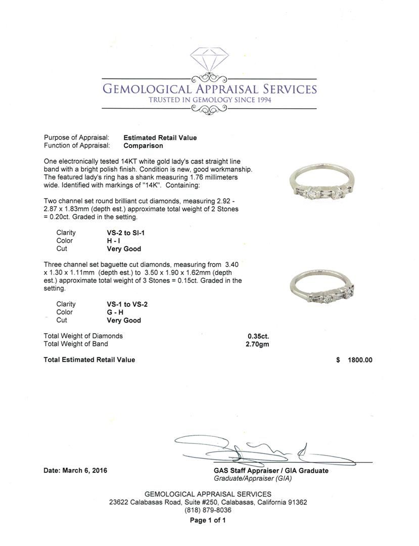 One electronically tested 14KT white gold lady's cast straight line band with a bright polish finish. The featured lady's ring has a shank measuring 1.76 millimeters wide. Identified with markings of "14K". Condition is new, good workmanship. Containing: Two channel set round brilliant cut diamonds, measuring 2.92 - 2.87 x 1.83mm (depth est.) approximate. Total Weight of 2 Stones = 0.20ct. Graded in the setting. Clarity: VS-2 to SI-1. Color: H - I, Cut Very Good. Three channel set baguette cut diamonds, measuring from 3.40 x 1.30 x 1.11mm (depth est.) to 3.50 x 1.90 x 1.62mm (depth est.) approximate. Total Weight of 3 Stones = 0.15ct. Graded in the setting. Clarity: VS-1 to VS-2. Color: G - H, Cut Very Good. Total Weight of Diamonds 0.35ct. Total Weight of Band 2.70 grams. GAS Appraised at $1,800.00.