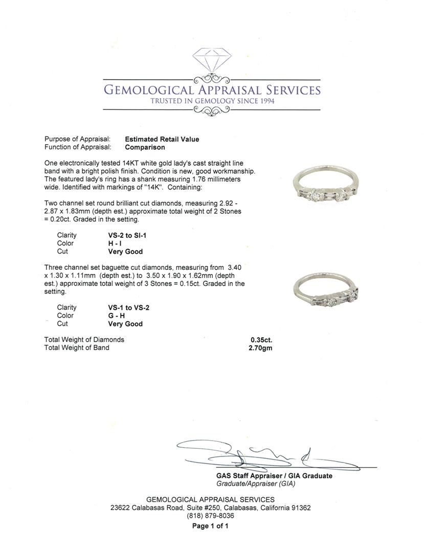 One electronically tested 14KT white gold lady's cast straight line band with a bright polish finish. The featured lady's ring has a shank measuring 1.76 millimeters wide. Identified with markings of "14K". Condition is new, good workmanship. Containing: Two channel set round brilliant cut diamonds, measuring 2.92 - 2.87 x 1.83mm (depth est.) approximate. Total Weight of 2 Stones = 0.20ct. Graded in the setting. Clarity: VS-2 to SI-1. Color: H - I, Cut Very Good. Three channel set baguette cut diamonds, measuring from 3.40 x 1.30 x 1.11mm (depth est.) to 3.50 x 1.90 x 1.62mm (depth est.) approximate. Total Weight of 3 Stones = 0.15ct. Graded in the setting. Clarity: VS-1 to VS-2. Color: G - H, Cut Very Good. Total Weight of Diamonds 0.35ct. Total Weight of Band 2.70 grams. GAS Appraised.