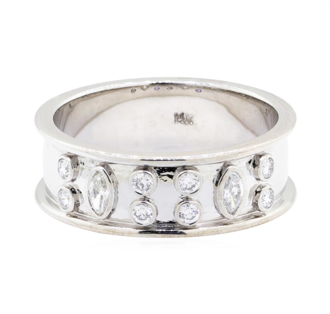 One electronically tested 14KT white gold lady's combination cast & assembled fashion ring with a bright polish finish. The featured lady's ring has a shank measuring 7.35 millimeters wide. Identified with markings of '14K'. Condition is new, good workmanship. Containing: Two bezel set marquise shaped cut diamonds, measuring 4.20 x 2.20 x 1.39mm (depth est.) approximate total weight of 2 Stones = 0.15ct. Graded in the setting. Color H - I Clarity VS-2 to SI-1 Cut Very Good Eight bezel set round brilliant cut diamonds, measuring 2.00 - 1.95 x 1.23mm (depth est.) approximate total weight of 8 Stones = 0.25ct. Graded in the setting. Color G - H Clarity VS-1 to SI-1 Cut Very Good. Total Weight of Diamonds 0.40ct. Total Weight of Ring 7.00gm. GAS Appraised.