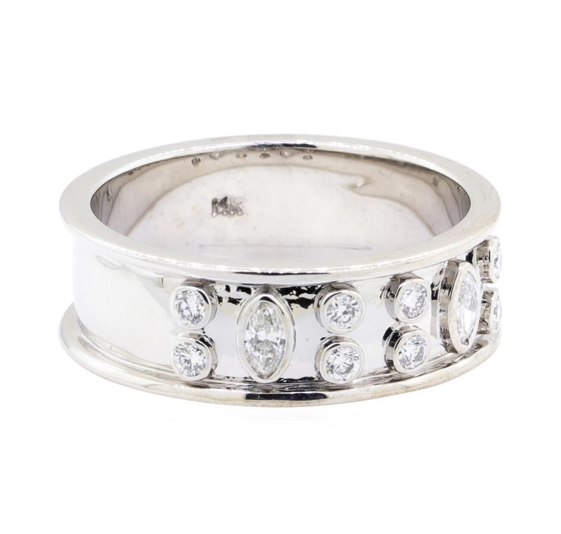 One electronically tested 14KT white gold lady's combination cast & assembled fashion ring with a bright polish finish. The featured lady's ring has a shank measuring 7.35 millimeters wide. Identified with markings of '14K'. Condition is new, good workmanship. Containing: Two bezel set marquise shaped cut diamonds, measuring 4.20 x 2.20 x 1.39mm (depth est.) approximate total weight of 2 Stones = 0.15ct. Graded in the setting. Color H - I Clarity VS-2 to SI-1 Cut Very Good Eight bezel set round brilliant cut diamonds, measuring 2.00 - 1.95 x 1.23mm (depth est.) approximate total weight of 8 Stones = 0.25ct. Graded in the setting. Color G - H Clarity VS-1 to SI-1 Cut Very Good. Total Weight of Diamonds 0.40ct. Total Weight of Ring 7.00gm. GAS Appraised.