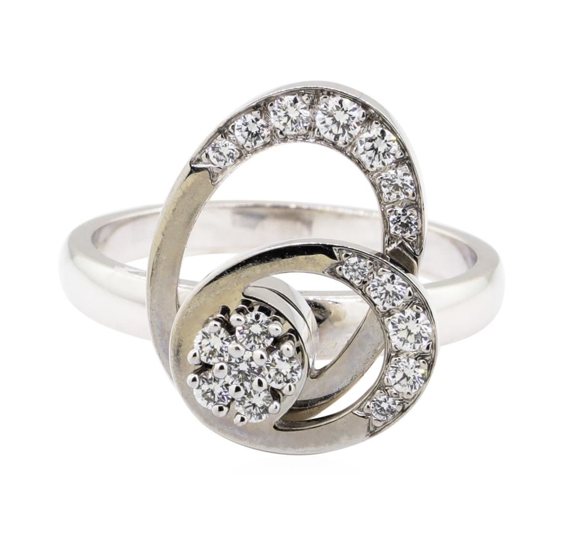 One electronically tested 14KT white gold lady's combination cast & assembled fashion designer ring with a double spinning halo with a bright polish finish. The featured lady's ring has a shank measuring 2.14 millimeters wide. Trademark is N. Teufel. Identified with markings of '14K'. Condition is like new, good workmanship. Containing: Eighteen prong set round brilliant cut diamonds, measuring 2.00 - 1.60 x 1.12mm (depth est.) approximate total weight of 18 Stones = 0.40ct. Graded in the setting. Color G - H Clarity VS-1 to VS-2 Cut Ideal. Total Weight of Diamonds 0.40ct. Total Weight of Ring 5.30gm. GAS Appraised.
