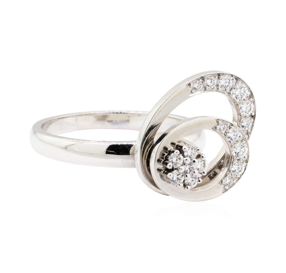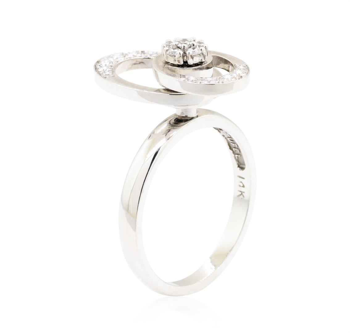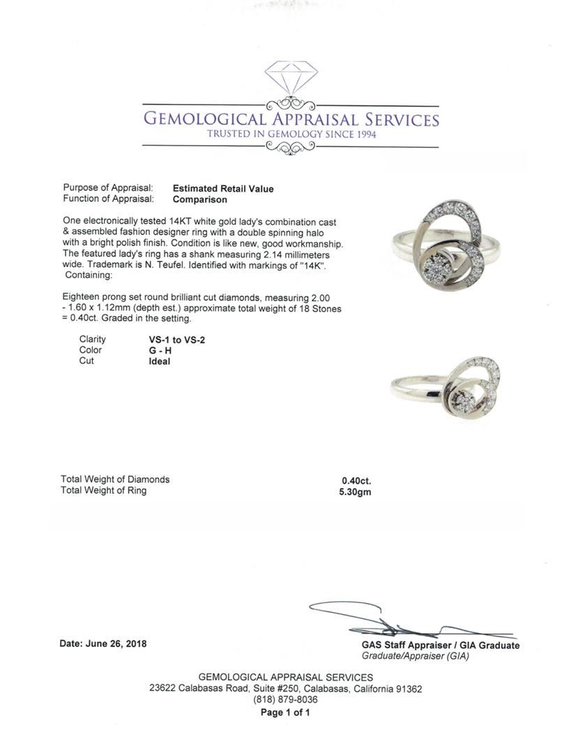 One electronically tested 14KT white gold lady's combination cast & assembled fashion designer ring with a double spinning halo with a bright polish finish. The featured lady's ring has a shank measuring 2.14 millimeters wide. Trademark is N. Teufel. Identified with markings of '14K'. Condition is like new, good workmanship. Containing: Eighteen prong set round brilliant cut diamonds, measuring 2.00 - 1.60 x 1.12mm (depth est.) approximate total weight of 18 Stones = 0.40ct. Graded in the setting. Color G - H Clarity VS-1 to VS-2 Cut Ideal. Total Weight of Diamonds 0.40ct. Total Weight of Ring 5.30gm. GAS Appraised.