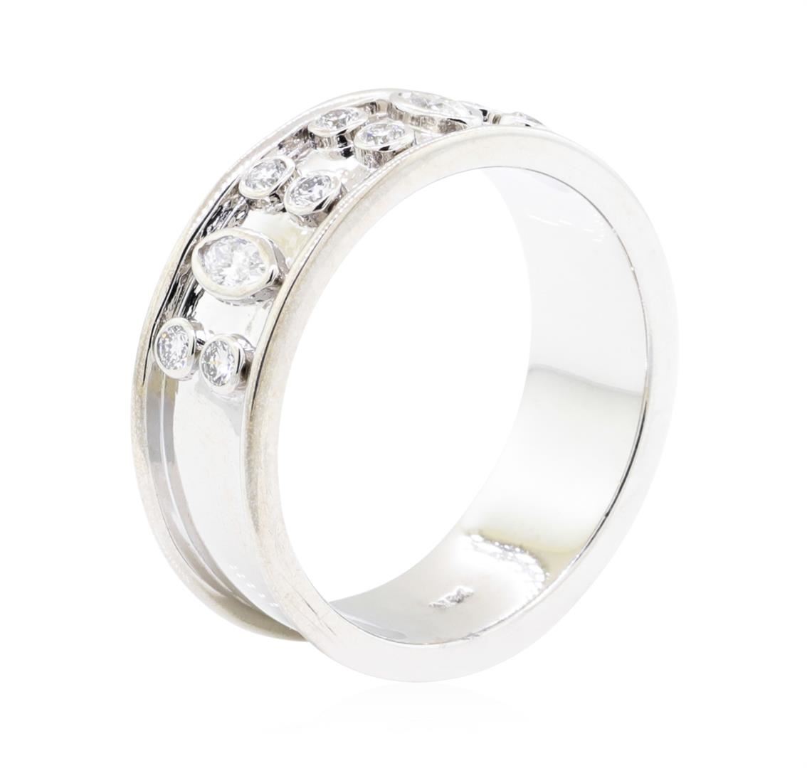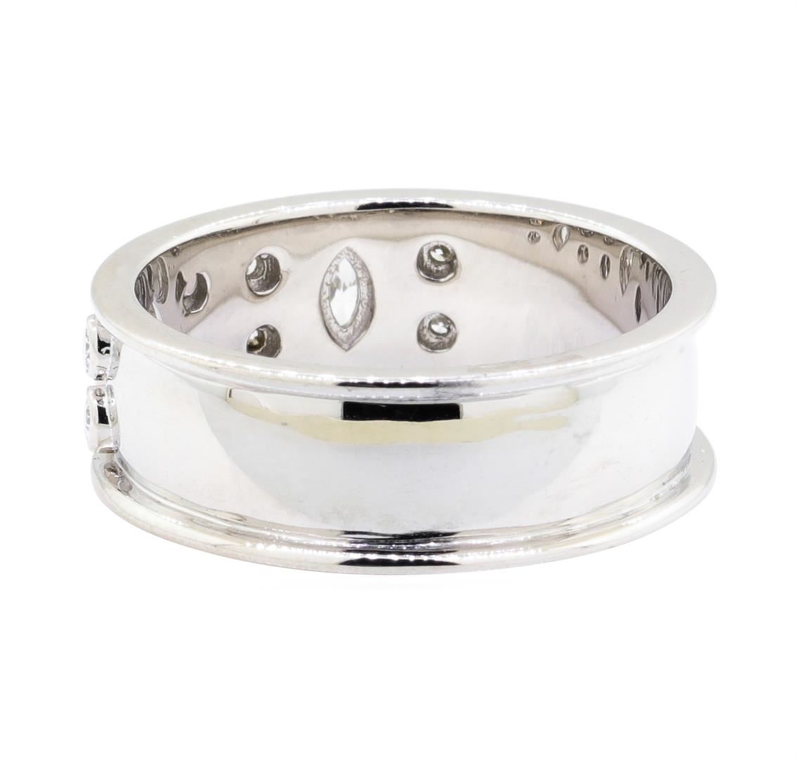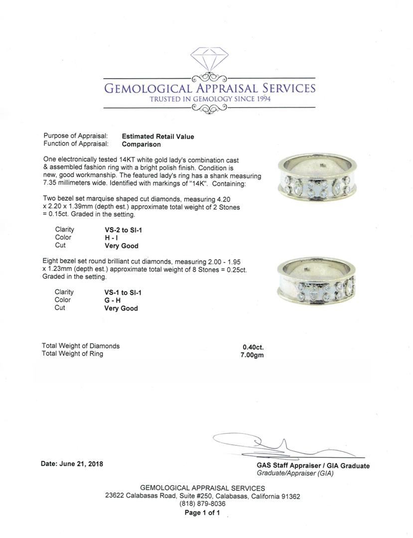 One electronically tested 14KT white gold lady's combination cast & assembled fashion ring with a bright polish finish. The featured lady's ring has a shank measuring 7.35 millimeters wide. Identified with markings of '14K'. Condition is new, good workmanship. Containing: Two bezel set marquise shaped cut diamonds, measuring 4.20 x 2.20 x 1.39mm (depth est.) approximate total weight of 2 Stones = 0.15ct. Graded in the setting. Color H - I Clarity VS-2 to SI-1 Cut Very Good Eight bezel set round brilliant cut diamonds, measuring 2.00 - 1.95 x 1.23mm (depth est.) approximate total weight of 8 Stones = 0.25ct. Graded in the setting. Color G - H Clarity VS-1 to SI-1 Cut Very Good. Total Weight of Diamonds 0.40ct. Total Weight of Ring 7.00gm. GAS Appraised.