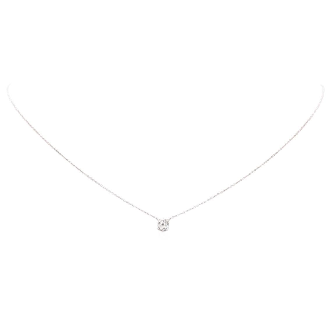 One solitaire necklace with an attached sixteen inch long 1mm rounded cable link chain featuring: 14KT white gold weighing 1.4 grams containing one diamond weighing 0.40ct.