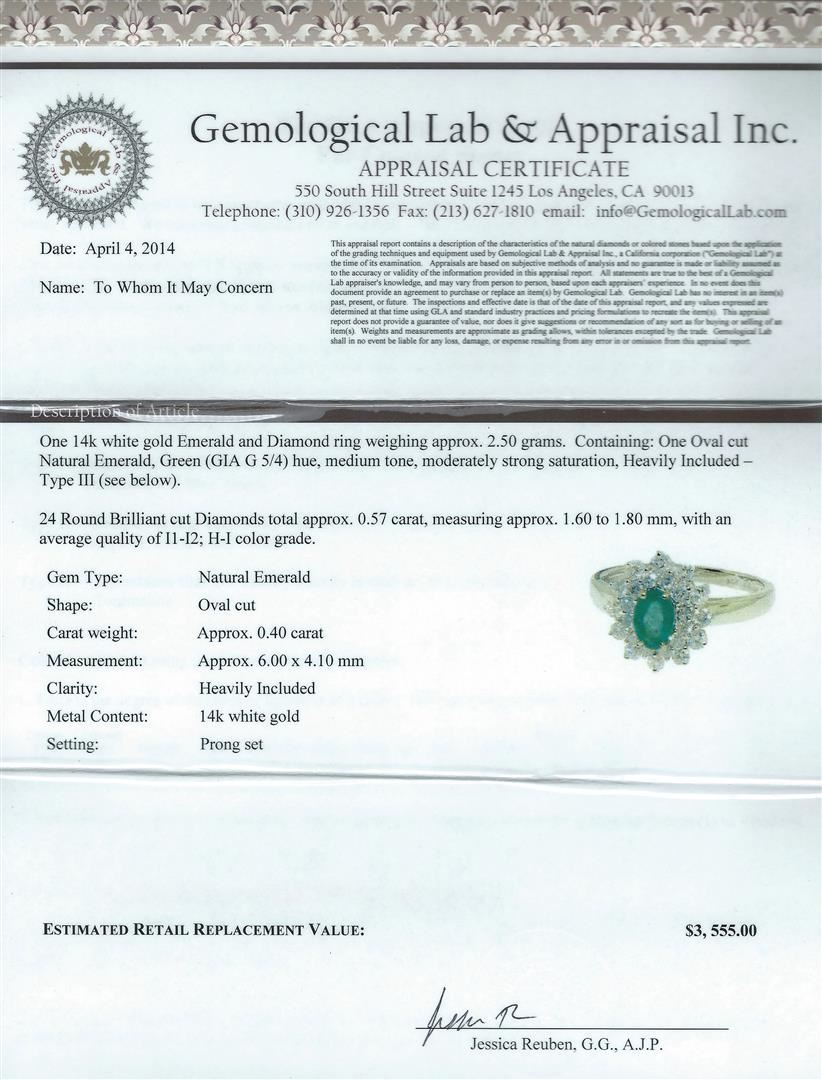 One 14KT white gold emerald and diamond ring weighing approx. 2.50 grams. Containing: one oval cut natural emerald, approx. 0.40 carat, green (GIA G 5/4) hue, medium tone, moderately strong saturation, heavily included- type III. 24 round brilliant cut diamonds total approx. 0.57 carats, measuring approx. 1.60 to 1.88mm, with an average quality of I1-I2; H-I color. Gemology Lab Appraised at $3,555.00.