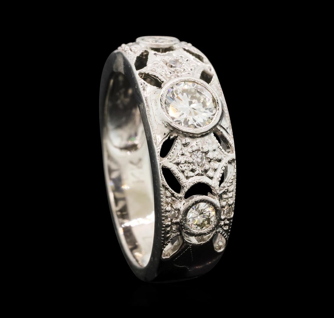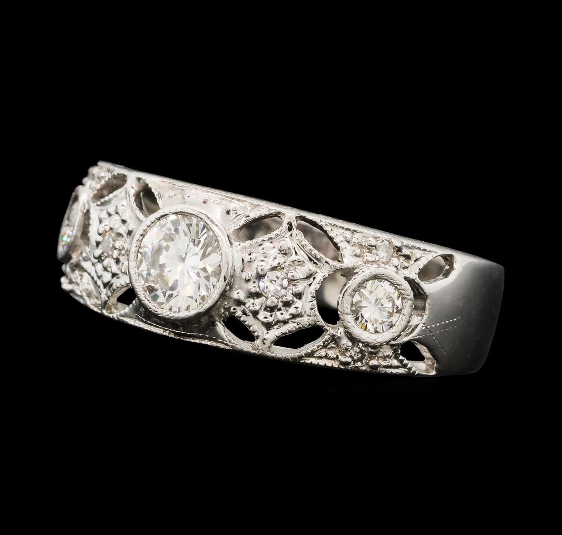 One electronically tested 14KT white gold lady's cast vintage style fashion ring with a straight line motif with a bright polish with milgrain detailing finish. The featured lady's ring has a shank measuring 3.70 millimeters wide. Identified with markings of "14K". Condition is like new, good workmanship. Containing: One bezel set round brilliant cut diamond, measuring 4.45 - 4.40 x 2.37mm (depth est.) , 5.00.%. GTCF approximate weight of 0.30ct. Graded in the setting. Color GClarity VS-2 Cut Good Two bezel set round brilliant cut diamonds, measuring 2.40 - 2.35 x 1.45mm (depth est.) approximate. Total Weight of 2 Stones = 0.10ct. Graded in the setting. Color I - JClarity VS-2 to SI-1 Cut Good Two prong set single cut diamonds, measuring 1.40 - 1.30 x 0.84mm (depth est.) approximate. Total Weight of 2 Stones = 0.02ct. Graded in the setting. Color H - I Clarity SI-2 to I-1 Cut Good. Total Weight of Diamonds 0.42ct.. Total Weight of Ring 3.00gm. GAS Appraised.