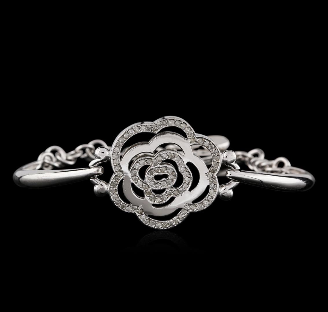 One electronically tested 14KT white gold ladies cast diamond bracelet with a lobster claw clasp with a bright and brushed finish. Measurements: 7.25" in length. Identified with markings of "585". Condition is new. Containing: Ninety prong set round brilliant cut diamonds, measuring 1.10 - 1.10 x 0.66mm (depth est.) approximate total weight of 90 Stones = 0.43ct. Clarity: I-2 to I-3. Color: I - J. All diamonds are graded in the mounting, unless otherwise stated. Total Weight of Diamonds 0.43ct. Total Weight of Bracelet 14.30 grams. GGL Appraised at $3,225.00.