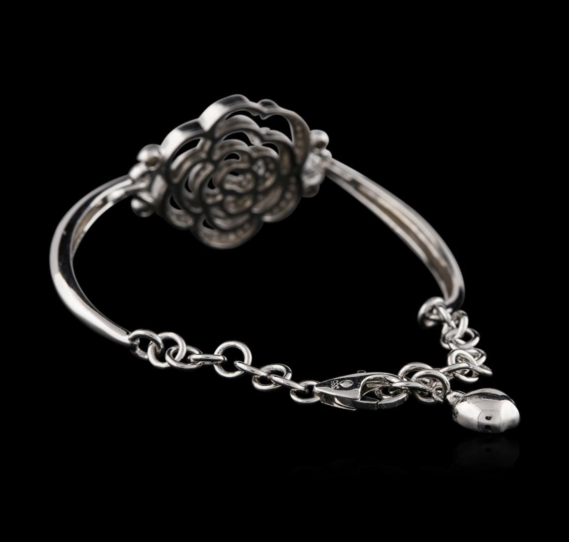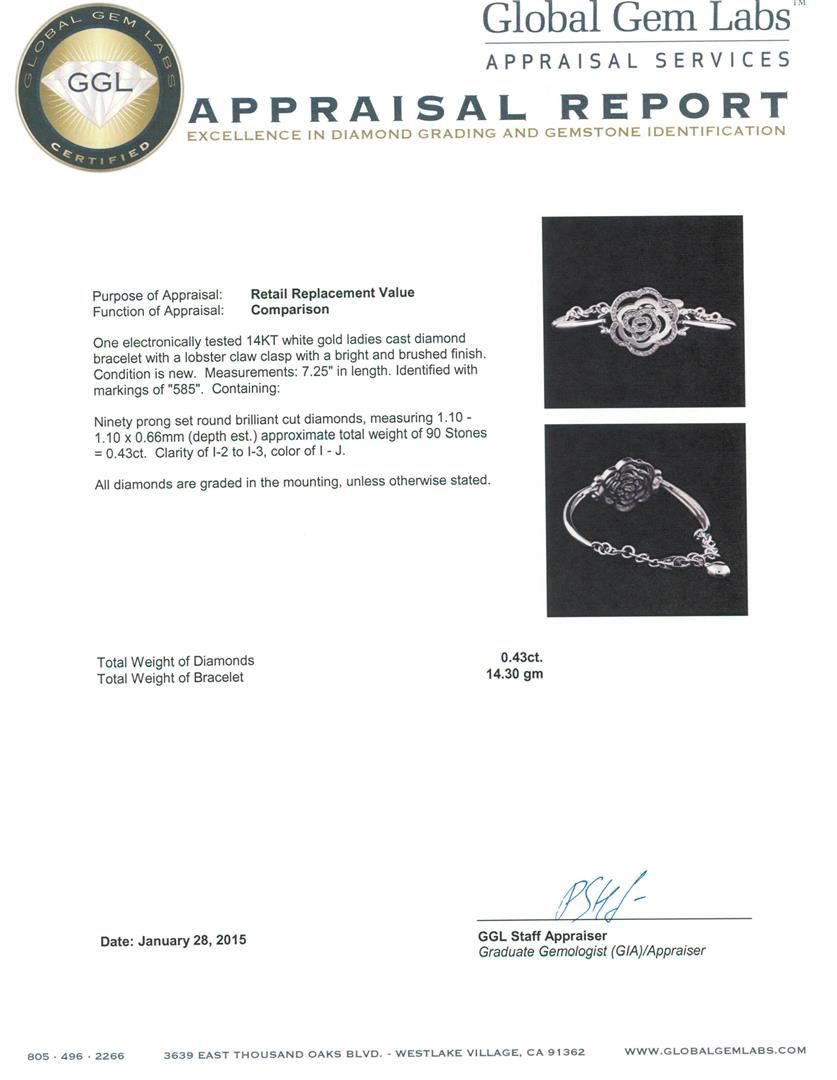 One electronically tested 14KT white gold ladies cast diamond bracelet with a lobster claw clasp with a bright and brushed finish. Measurements: 7.25" in length. Identified with markings of "585". Condition is new. Containing: Ninety prong set round brilliant cut diamonds, measuring 1.10 - 1.10 x 0.66mm (depth est.) approximate total weight of 90 Stones = 0.43ct. Clarity: I-2 to I-3. Color: I - J. All diamonds are graded in the mounting, unless otherwise stated. Total Weight of Diamonds 0.43ct. Total Weight of Bracelet 14.30 grams. GGL Appraised.