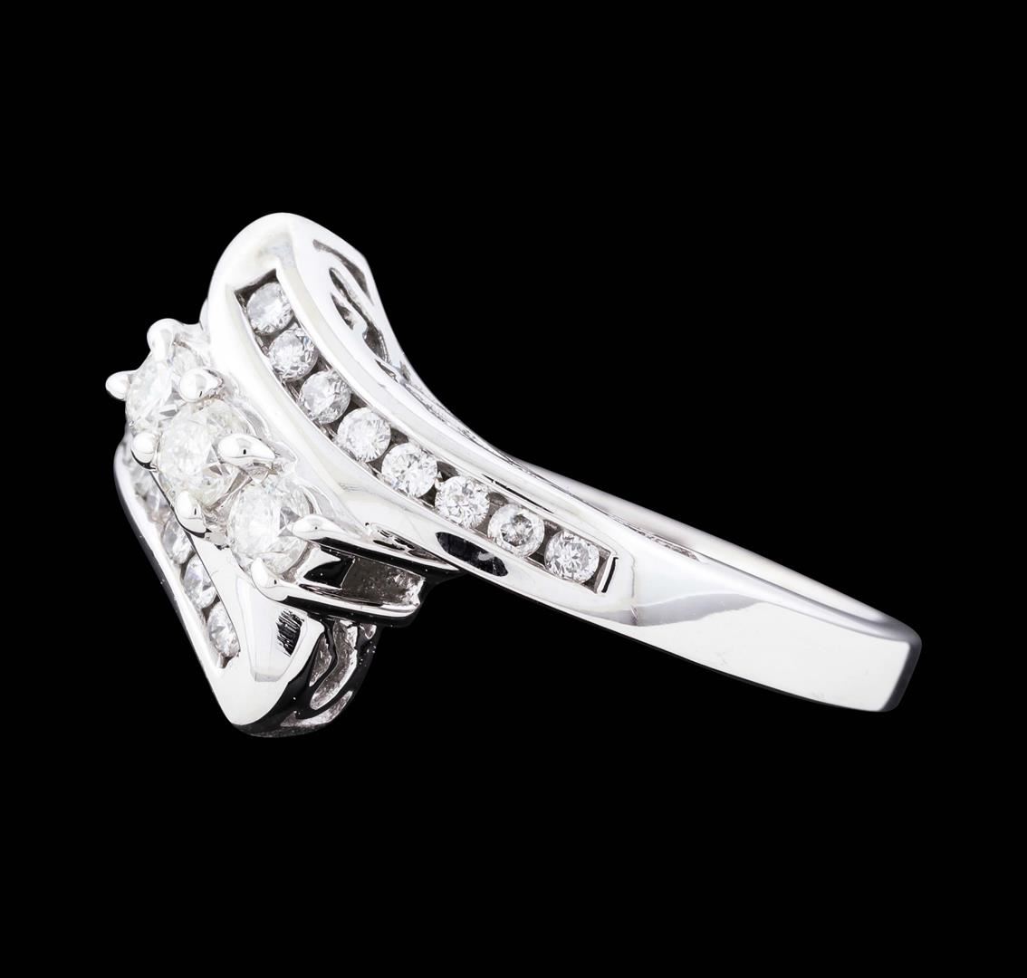 One electronically tested 14KT white gold lady's cast fashion ring with a bypass shank with a bright polish finish. The featured lady's ring has a shank measuring 2.10 millimeters wide. Identified with markings of "14K". Condition is new, good workmanship. Containing: Three prong set round brilliant cut diamonds, measuring 2.95 - 2.65 x 1.74mm (depth est.) approximate total weight of 3 Stones = 0.25ct. Graded in the setting. Clarity: SI-2 to I-1. Color: H - ICut Good Sixteen channel set round brilliant cut diamonds, measuring 1.50 - 1.40 x 0.87mm (depth est.) approximate total weight of 16 Stones = 0.18ct. Graded in the setting. Clarity: SI-2 to I-1. Color: H - ICut Good. Total Weight of Diamonds 0.43ct. Total Weight of Ring 5.00gm. GAS Appraised at $1,850.00.