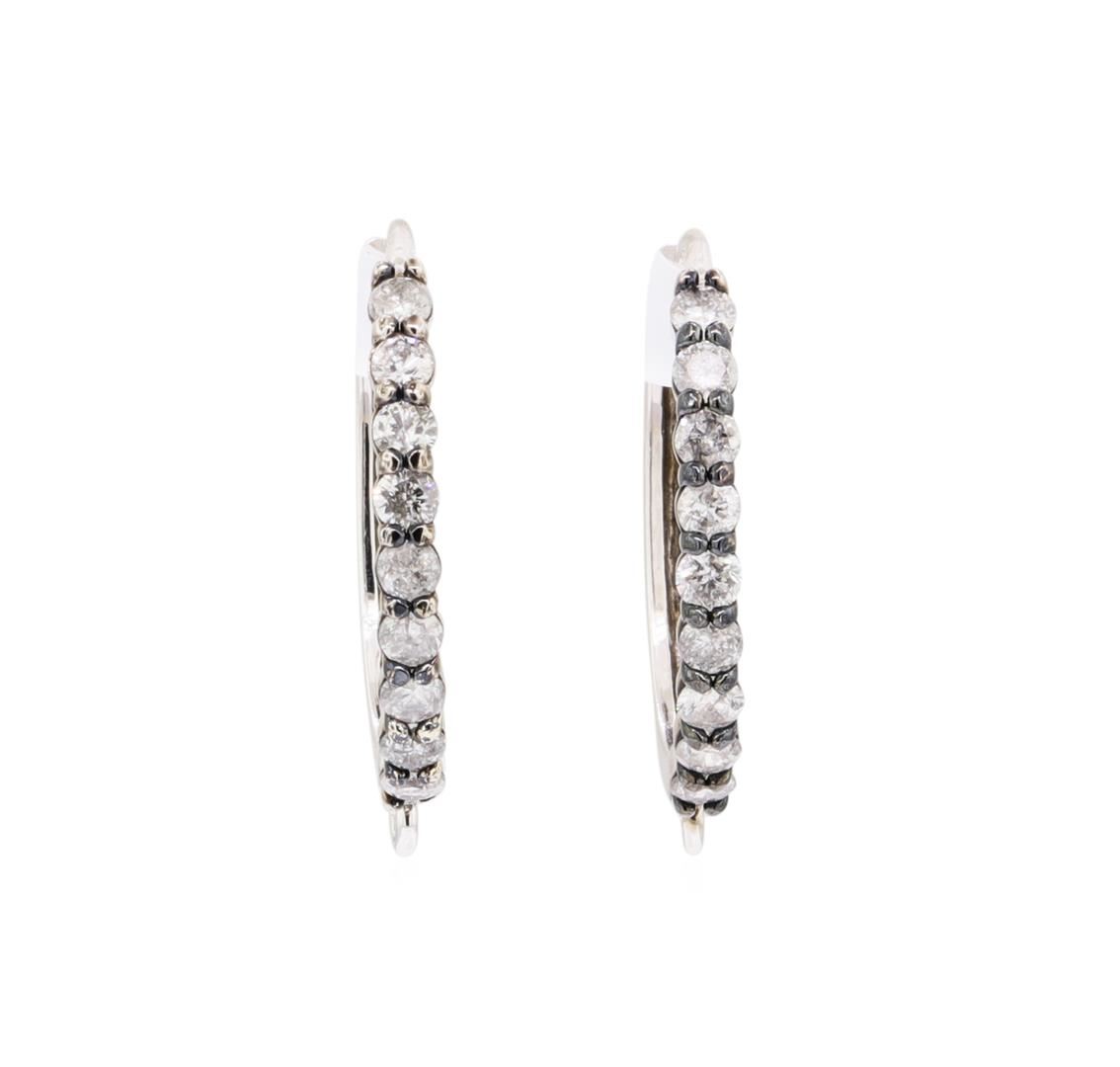 One pair of oval hoop earrings featuring: 14KT white gold weighing 2.3 grams containing diamonds weighing 0.45ctw. The prongs for the diamonds have been plated with black rhodium.