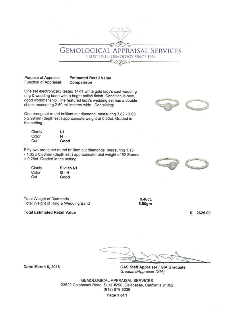 One set electronically tested 14KT white gold lady's cast wedding ring & wedding band with a bright polish finish. The featured lady's wedding set has a double shank measuring 2.50 millimeters wide. Condition is new, good workmanship. Containing: One prong set round brilliant cut diamond, measuring 3.82 - 3.80 x 2.29mm (depth est.) approximate weight of 0.20ct. Graded in the setting. Clarity: I-1. Color: H, Cut Good. Fifty-Two prong set round brilliant cut diamonds, measuring 1.15 - 1.05 x 0.68mm (depth est.) approximate. Total Weight of 52 Stones = 0.26ct. Graded in the setting. Clarity: SI-1 to I-1. Color: G - H, Cut Good. Total Weight of Diamonds 0.46ct. Total Weight of Ring & Wedding Band 5.50gm. GAS Appraised at $2,625.00.