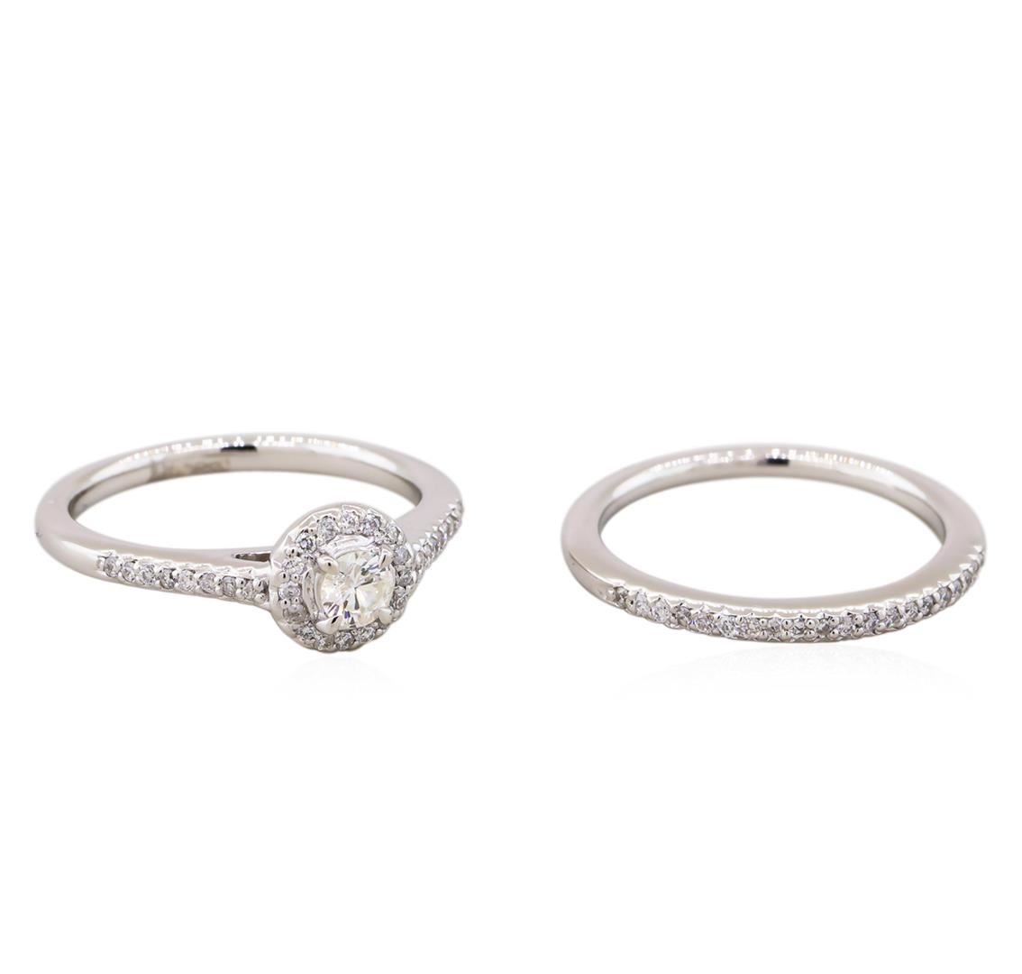 One set electronically tested 14KT white gold lady's cast wedding ring & wedding band with a bright polish finish. The featured lady's wedding set has a double shank measuring 2.50 millimeters wide. Condition is new, good workmanship. Containing: One prong set round brilliant cut diamond, measuring 3.82 - 3.80 x 2.29mm (depth est.) approximate weight of 0.20ct. Graded in the setting. Clarity: I-1. Color: H, Cut Good. Fifty-Two prong set round brilliant cut diamonds, measuring 1.15 - 1.05 x 0.68mm (depth est.) approximate. Total Weight of 52 Stones = 0.26ct. Graded in the setting. Clarity: SI-1 to I-1. Color: G - H, Cut Good. Total Weight of Diamonds 0.46ct. Total Weight of Ring & Wedding Band 5.50gm. GAS Appraised at $2,625.00.