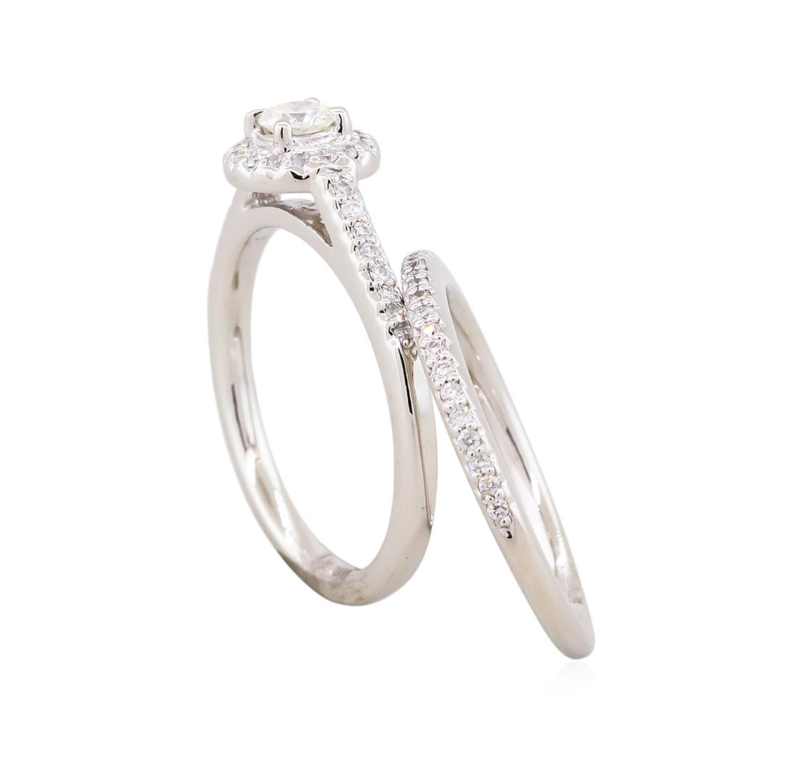 One set electronically tested 14KT white gold lady's cast wedding ring & wedding band with a bright polish finish. The featured lady's wedding set has a double shank measuring 2.50 millimeters wide. Condition is new, good workmanship. Containing: One prong set round brilliant cut diamond, measuring 3.82 - 3.80 x 2.29mm (depth est.) approximate weight of 0.20ct. Graded in the setting. Clarity: I-1. Color: H, Cut Good. Fifty-Two prong set round brilliant cut diamonds, measuring 1.15 - 1.05 x 0.68mm (depth est.) approximate. Total Weight of 52 Stones = 0.26ct. Graded in the setting. Clarity: SI-1 to I-1. Color: G - H, Cut Good. Total Weight of Diamonds 0.46ct. Total Weight of Ring & Wedding Band 5.50gm. GAS Appraised.